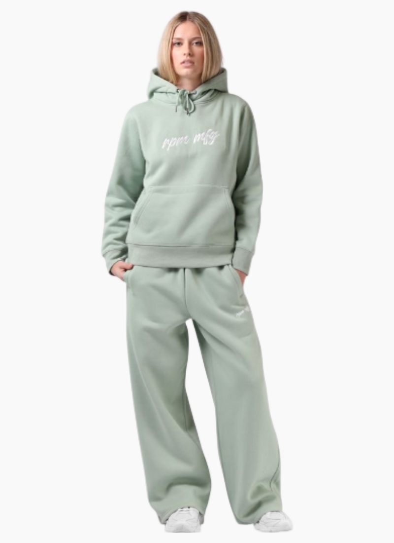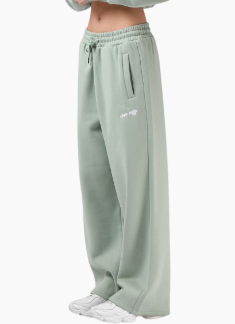 Introducing the WIDE LEG TRACK PANT from RPM. This relaxed, wide-leg pant in mineral green brings effortless lounge style with a contemporary silhouette.