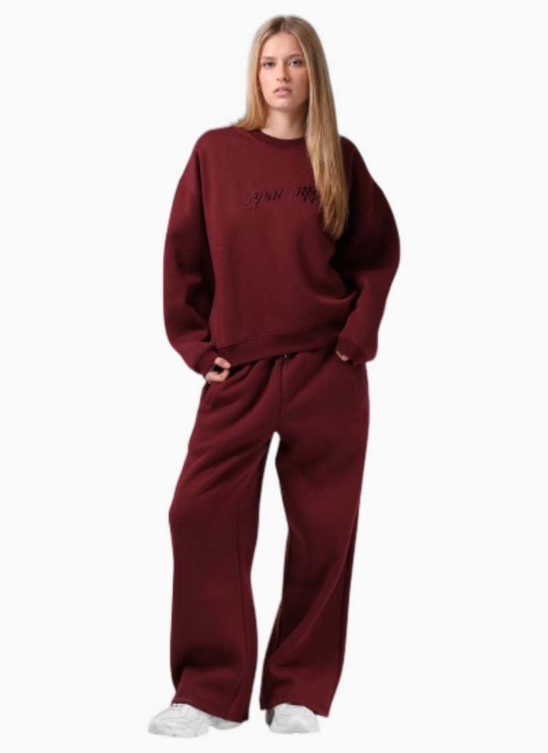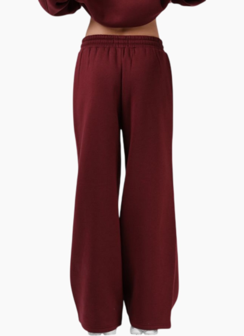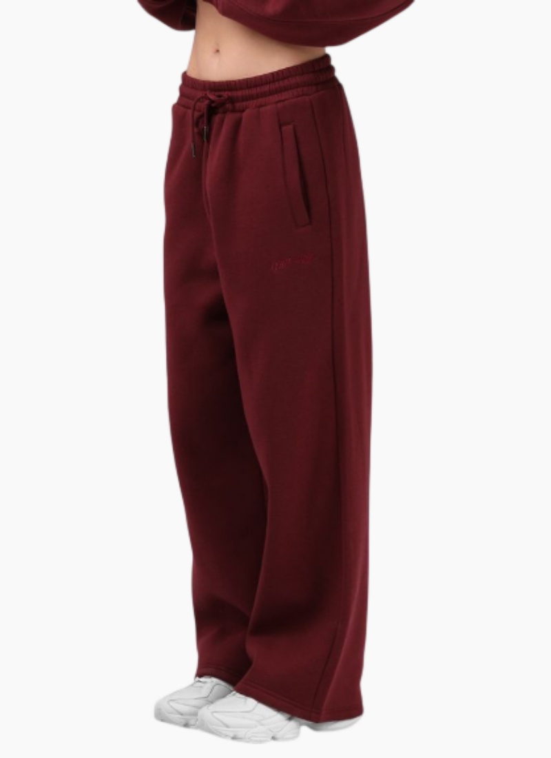 Introducing the RPM Wide Leg Trackpant. This relaxed women's Pants piece in rich burgundy is crafted from a cotton-blend fleece for cosy everyday wear.