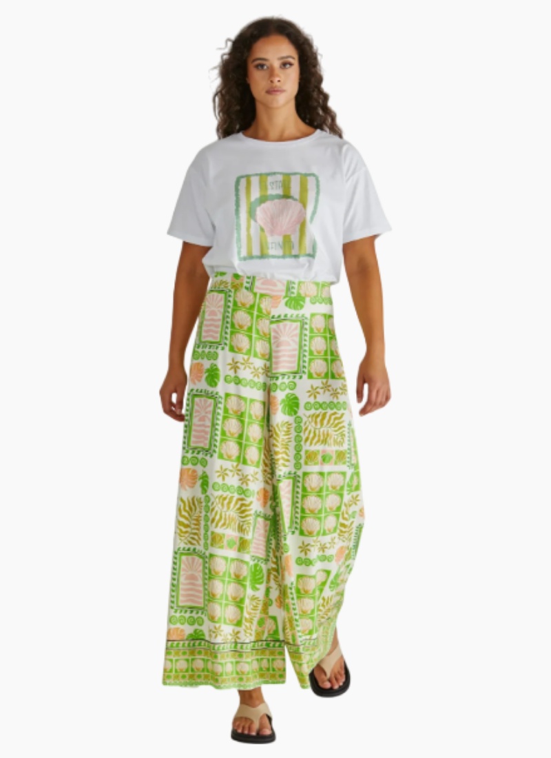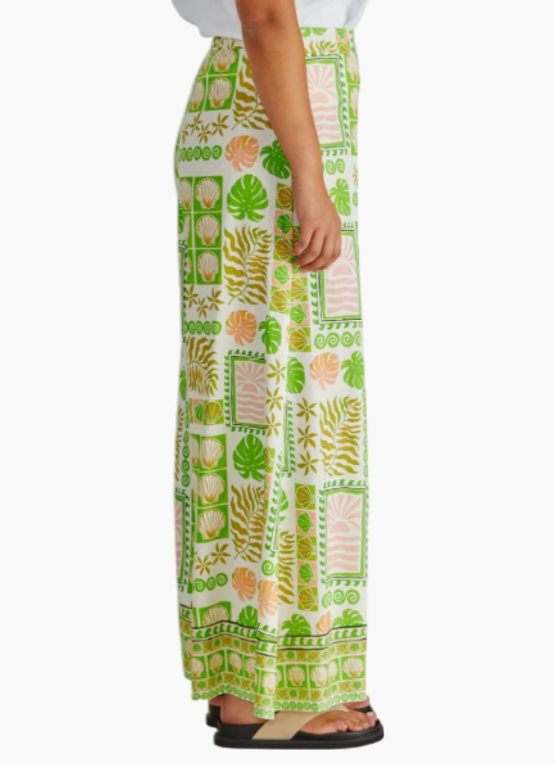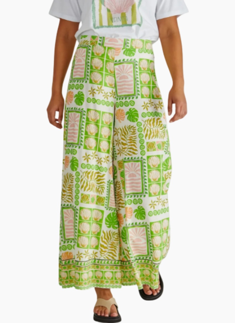 Introducing the SASS EMMETT WIDELEG PANT. A breezy, resort-ready pant that brings a fresh green print and effortless movement to your wardrobe.Make a statement with the Emmett Wide Leg Pant by Sass, featuring a bold green seashell patchwork print. Designed with a relaxed, flowy silhouette, these wide leg pants offer all-day comfort while adding a pop of personality to your wardrobe. Perfect for effortless dressing, they pair beautifully with simple tanks, crisp shirts, or your go-to summer tops. Details: Wide leg silhouette for a flattering, on-trend look Green seashell patchwork print Relaxed fit 80% Viscose, 20% Linen