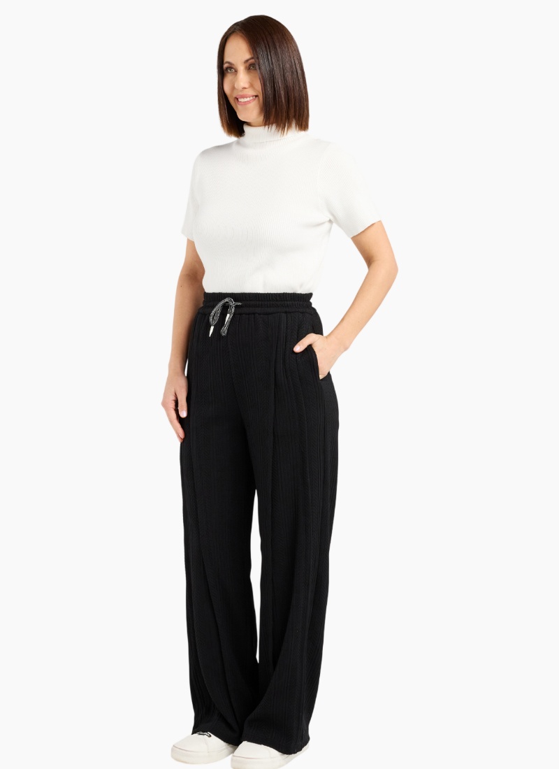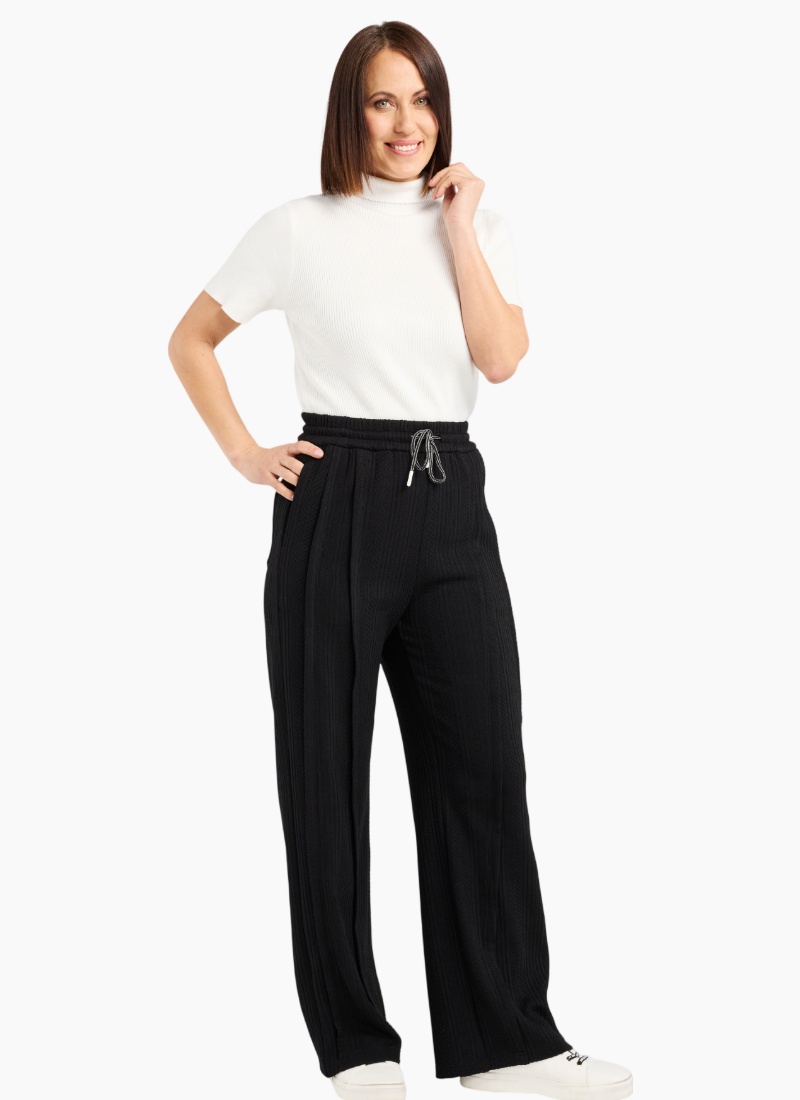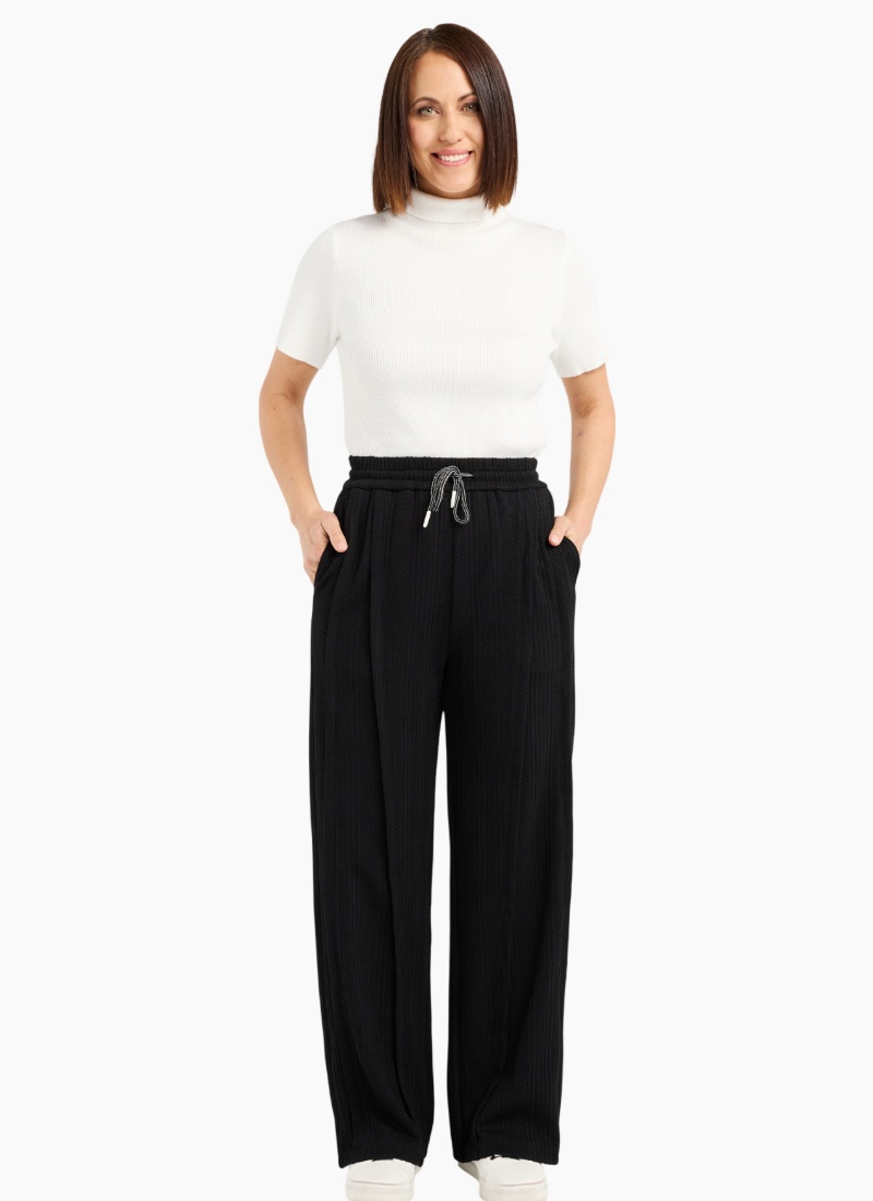 These classic black pants feature an elasticated waist with a drawstring for a comfortable, adjustable fit. Timeless and versatile, they pair effortlessly with any top. 91% Cotton 6% Polyester 3% Spx