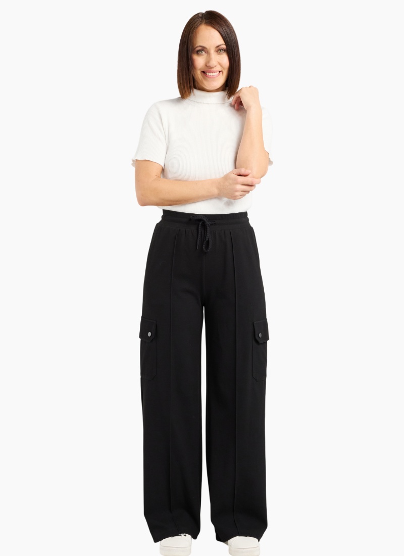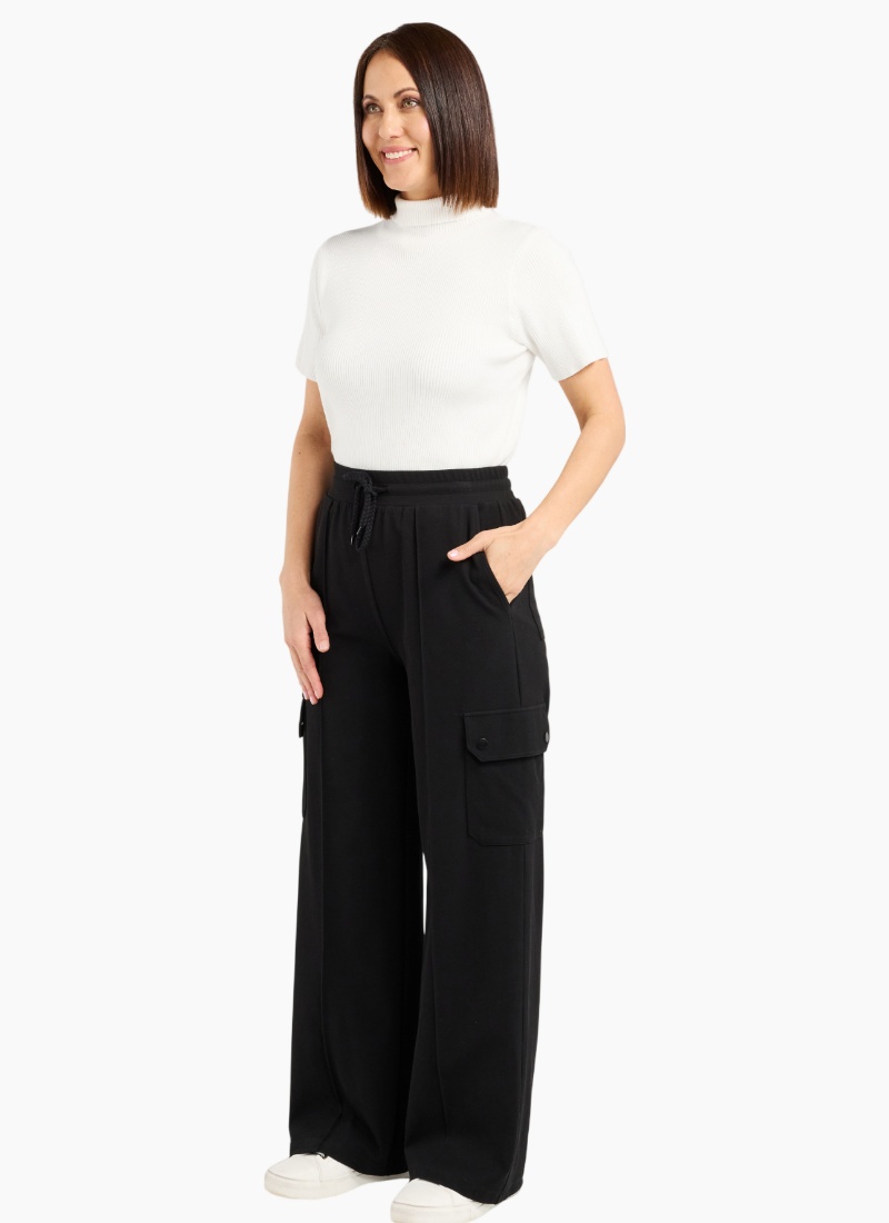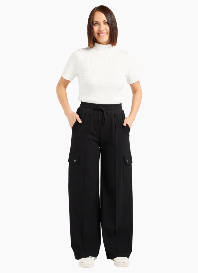 These wide-leg pants feature an elasticated waistband with drawstring for a comfortable, adjustable fit. Side pocket flaps running down the legs add a stylish, functional detail, balancing elegance with casual ease. 44.1% Polyester 37.5% Cotton 12.4% Tencel 6% Spx