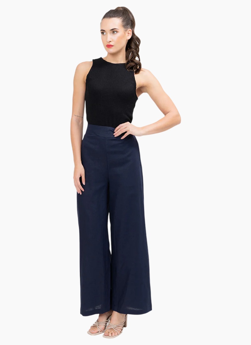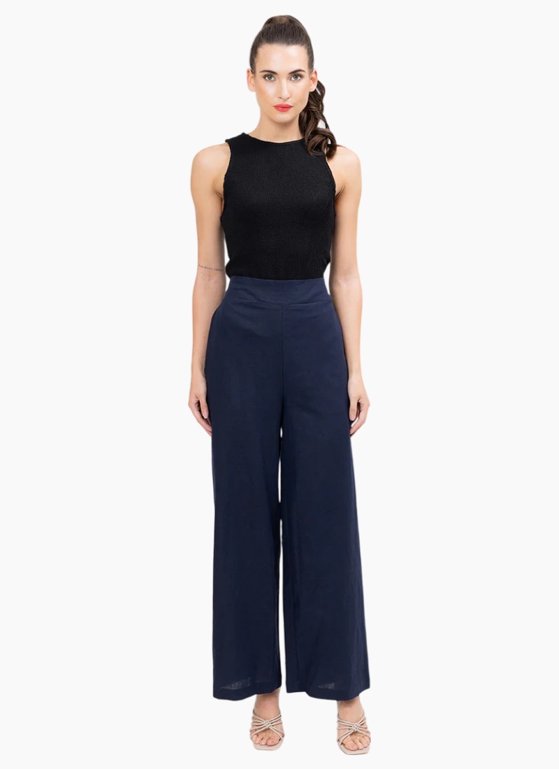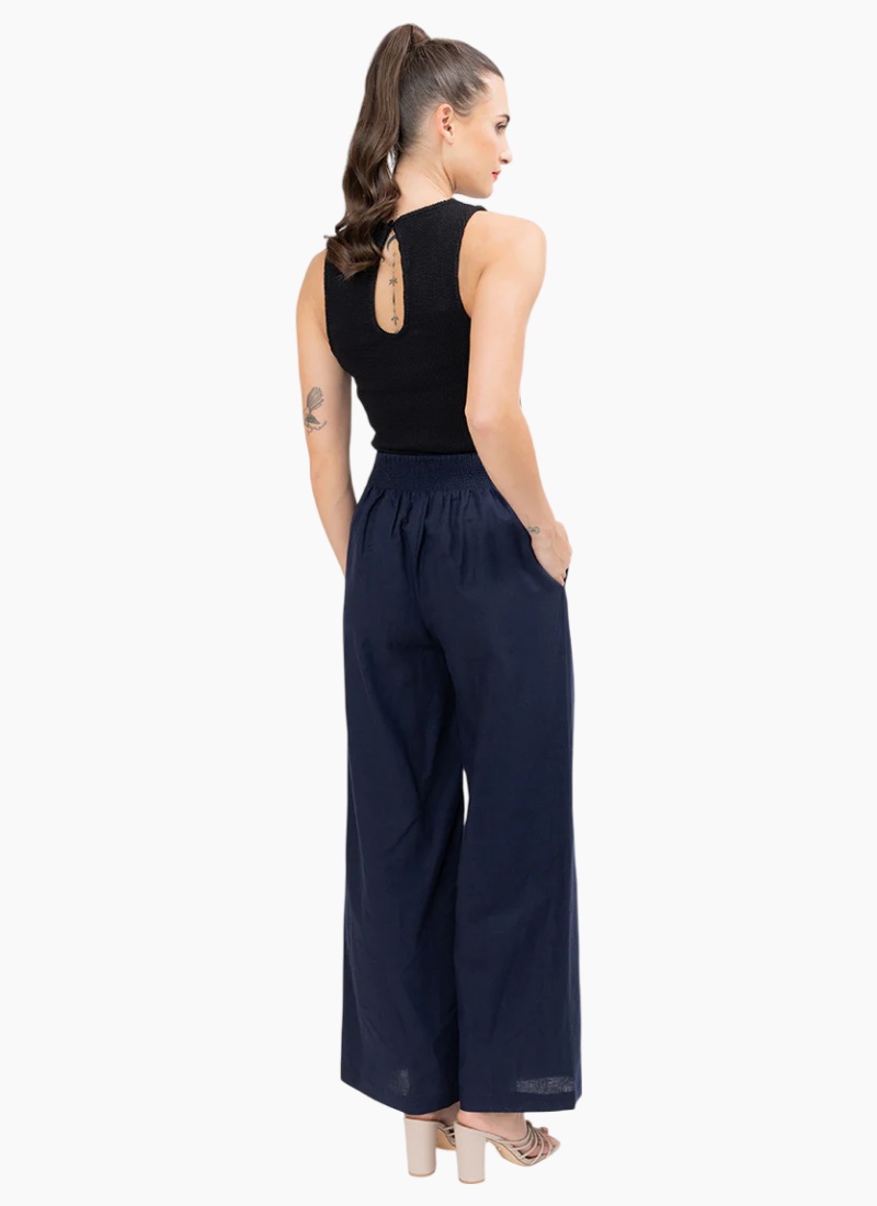Introducing the ESSENTIAL WIDE LEG FULL LENGTH PANT -NAVY from Seeking Lola. These navy pants offer a sophisticated, breathable staple that elevates everyday dressing.