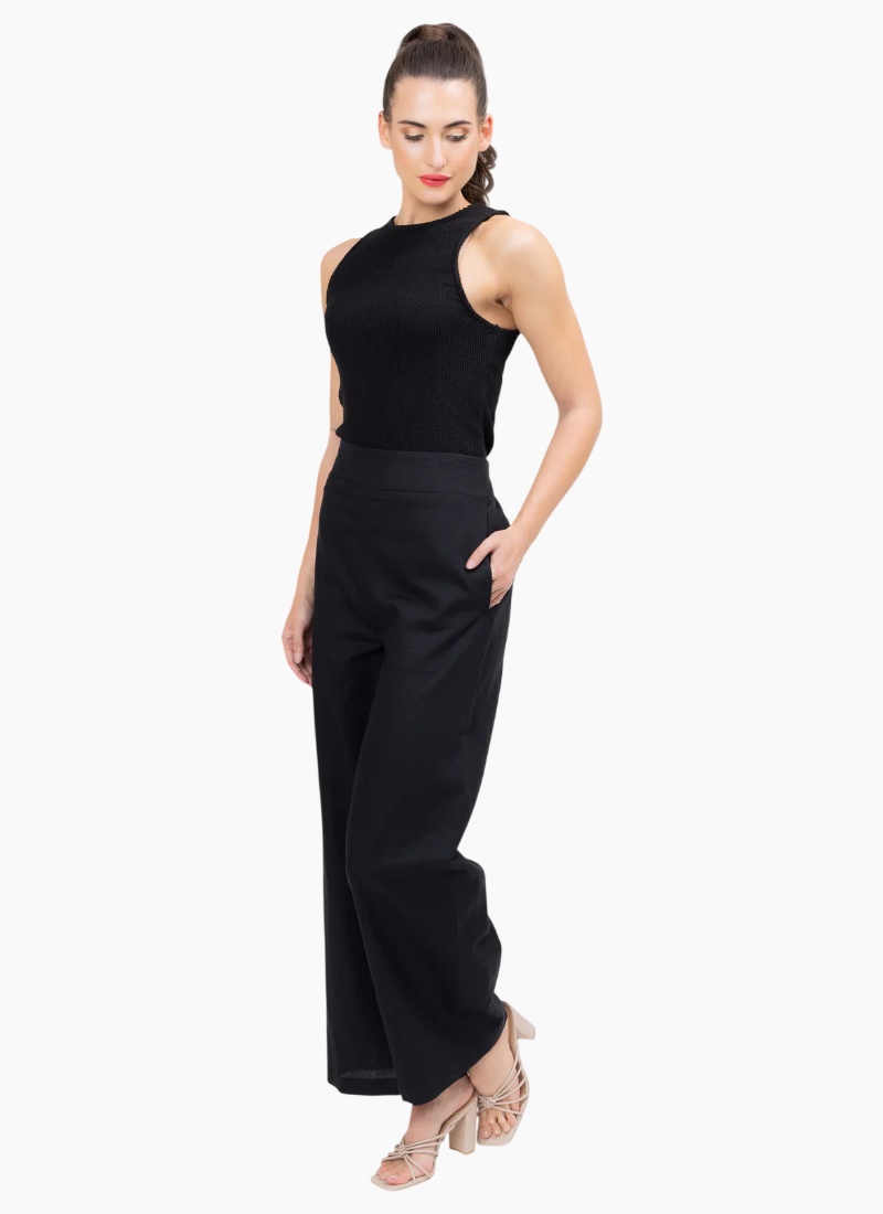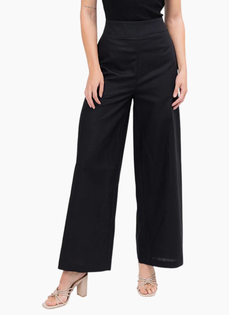 Introducing the Seeking Lola ESSENTIAL WIDE LEG PANT -BLACK. A refined black pant that blends modern tailoring with easygoing elegance.