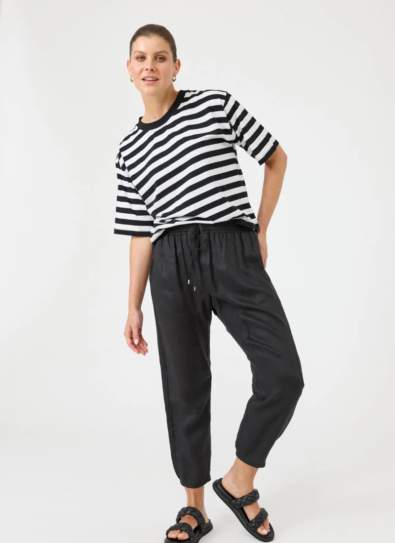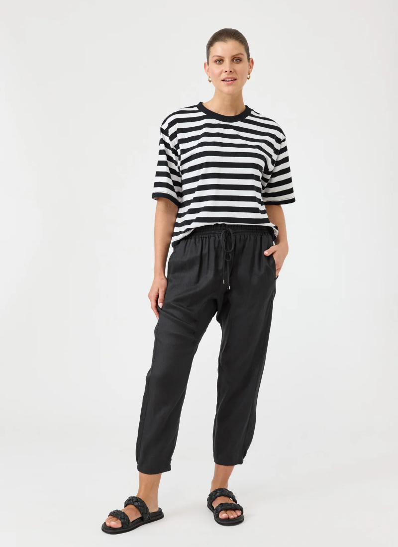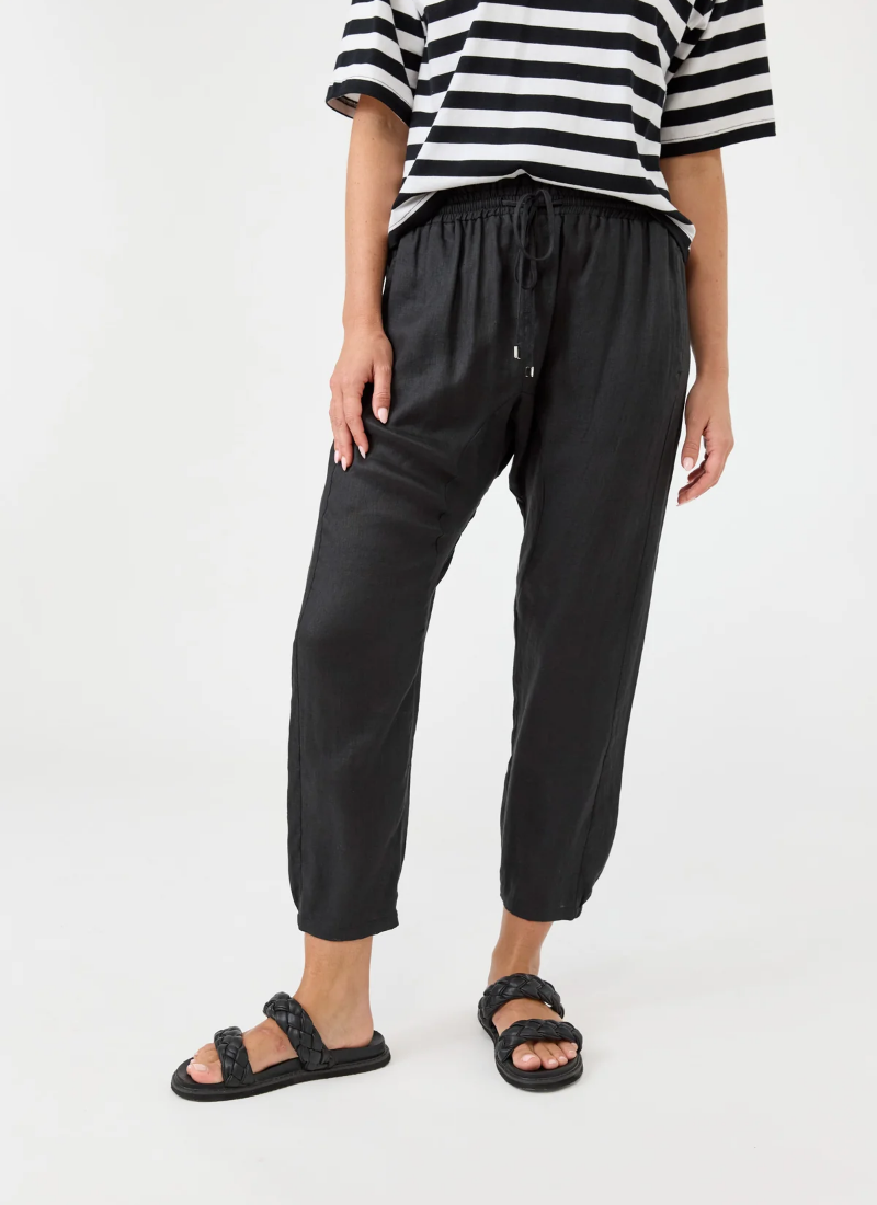 A casual essential designed for all-day comfort. Relaxed jogger silhouette with a slight drop crotch, tapered leg and elastic at the back of the cuff for subtle shape. Featuring a drawstring elasticated waist for a flexible fit. Crafted from 100% linen for breathable ease.Style with a simple tee and sneakers for a cool, minimal look. Relaxed fit Elasticised drawstring waistband Side pockets Tapered ankle
