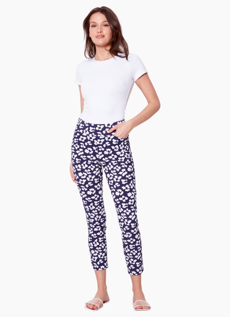 The Techno collection elegantly combines classic and modern styles with a range of fun and fresh motifs. Featuring summer prints and sophisticated tonal jacquards, the vibrant navy and white colors in a pull-on style elevate any outfit, offering a unique and fashionable look for any occasion. These pants also feature a lovely tulip hemline. Up! Pants are designed with our patented Tummy Control Technology, offering a pull-on elastic waistband that provides gentle contouring and a smooth, flattering fit. Each pair is crafted for comfort and ease, with no bulky buttons or awkward zippers to get in the way. The fit is designed to enhance your natural shape while allowing full freedom of movement, so you can feel confident and supported throughout your day. Whether you are at work, out for dinner or on the go, Up! Pants move with you and never compromise on comfort. Effortlessly chic and remarkably forgiving, Up! Pants are a wardrobe staple you may never want to take off. Once you try them, you’ll understand why so many women keep coming back for more. Made in Canada Material: Rayon, Nylon, Spandex