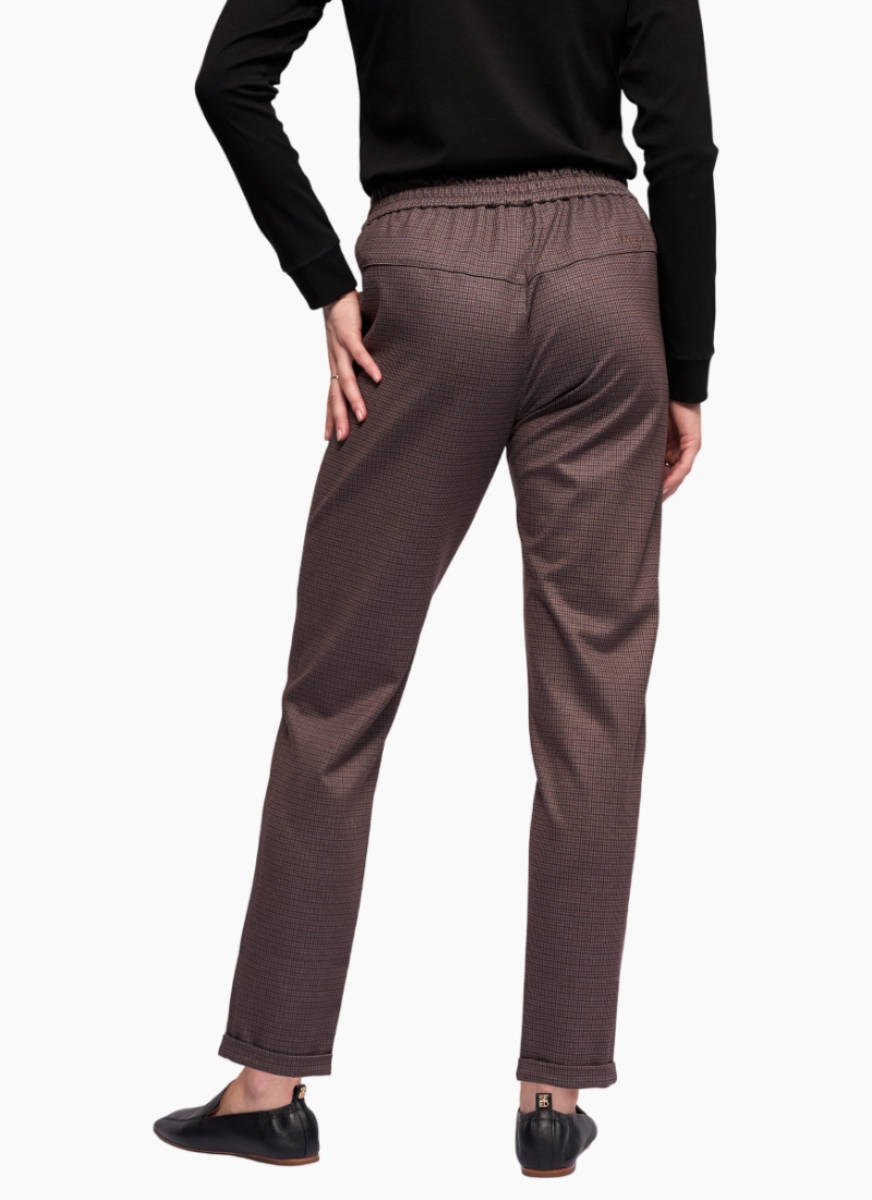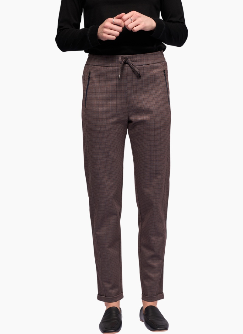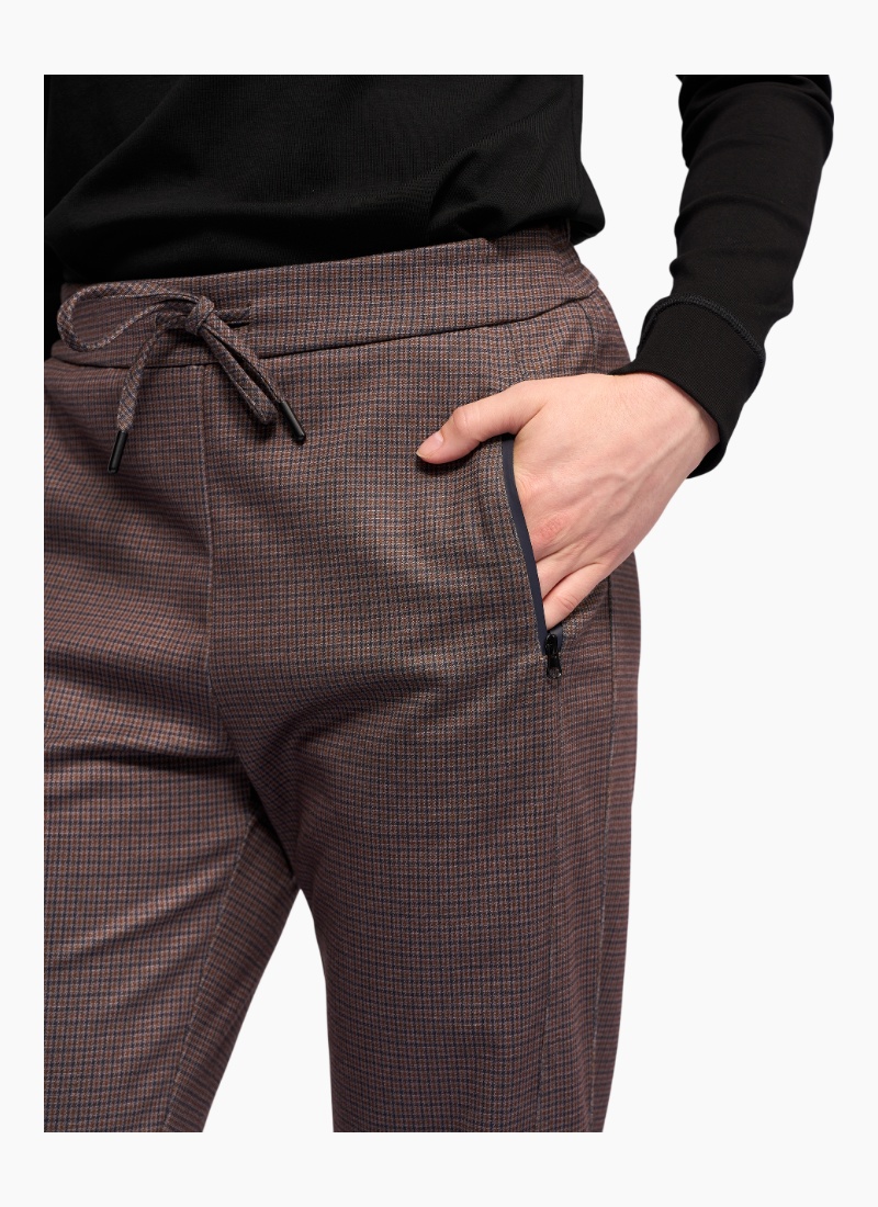 Relaxed-leg ankle-grazer pant in a stretch fabric, designed in our Chocolate check — a warm brown-toned pattern. Featuring a flat-front waist with elasticated back and an adjustable drawstring finished with metal aglets, this style blends comfort with a tailored look.
