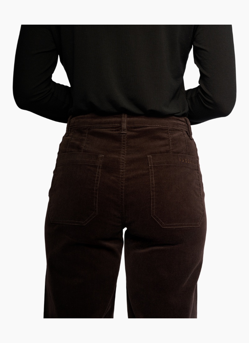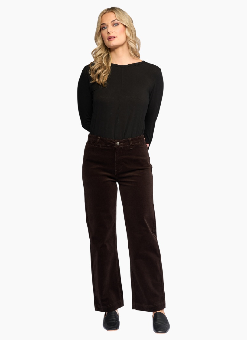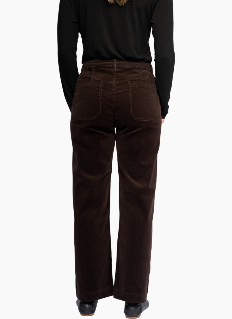 Straight-leg ankle-grazer pant in stretch pinwale cord, designed in our Walnut colour — a deep, earthy dark brown. A clean, modern silhouette with a minimal front finished with a single coin pocket and darted back shaping.