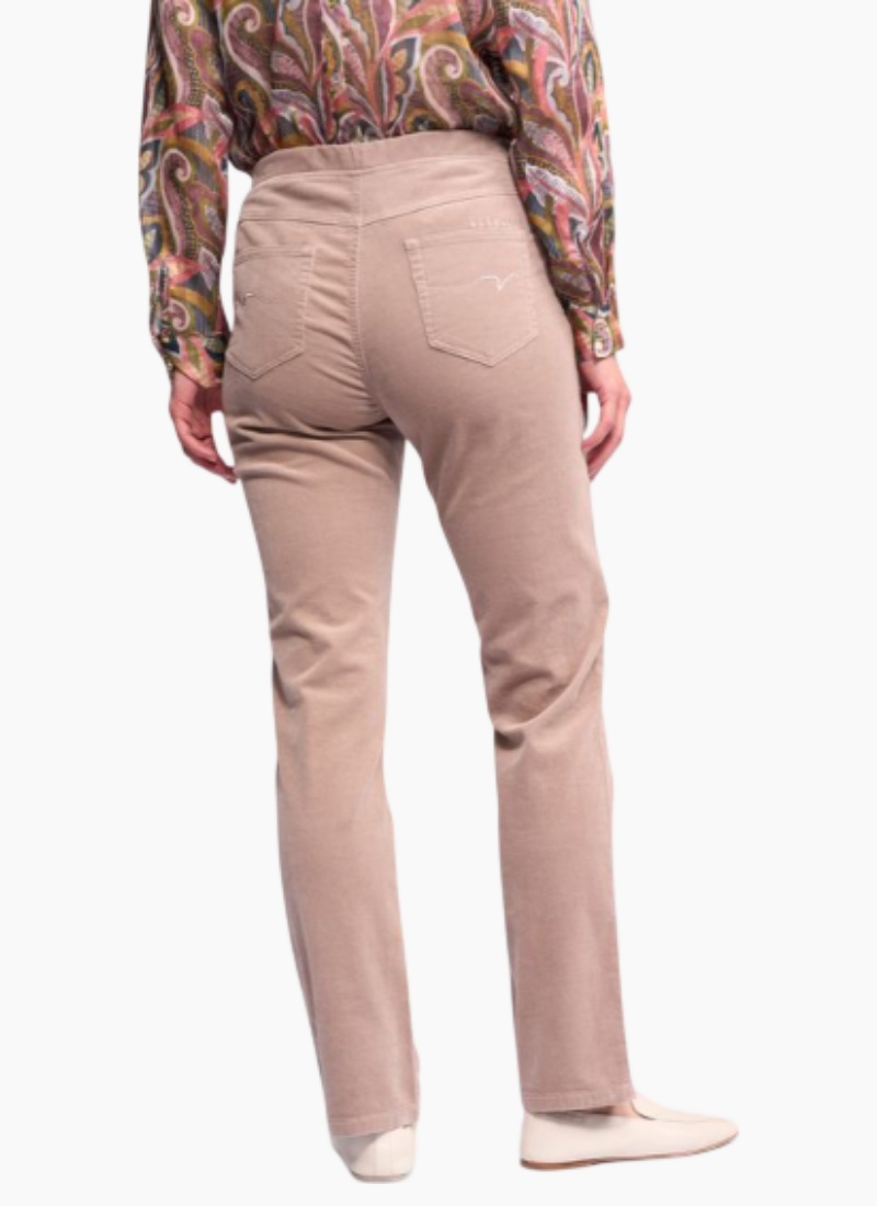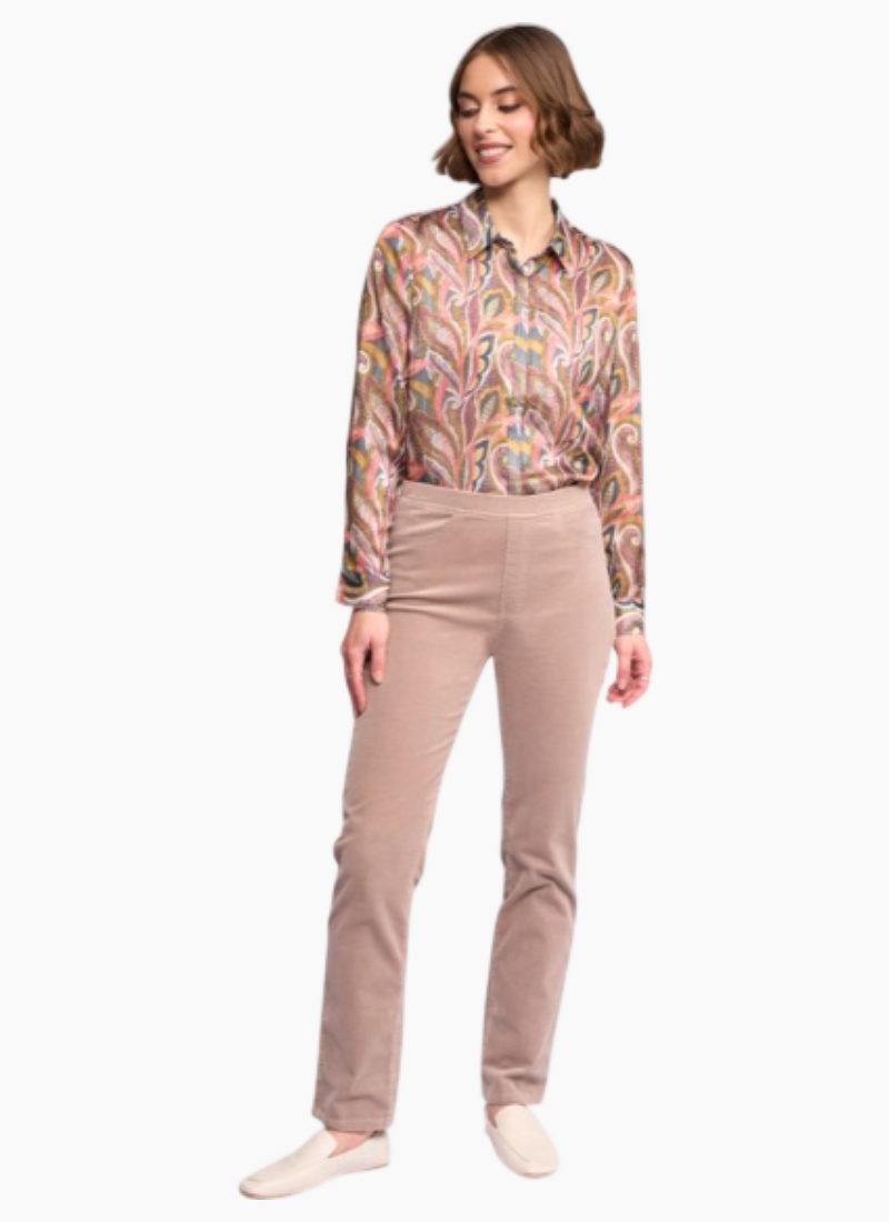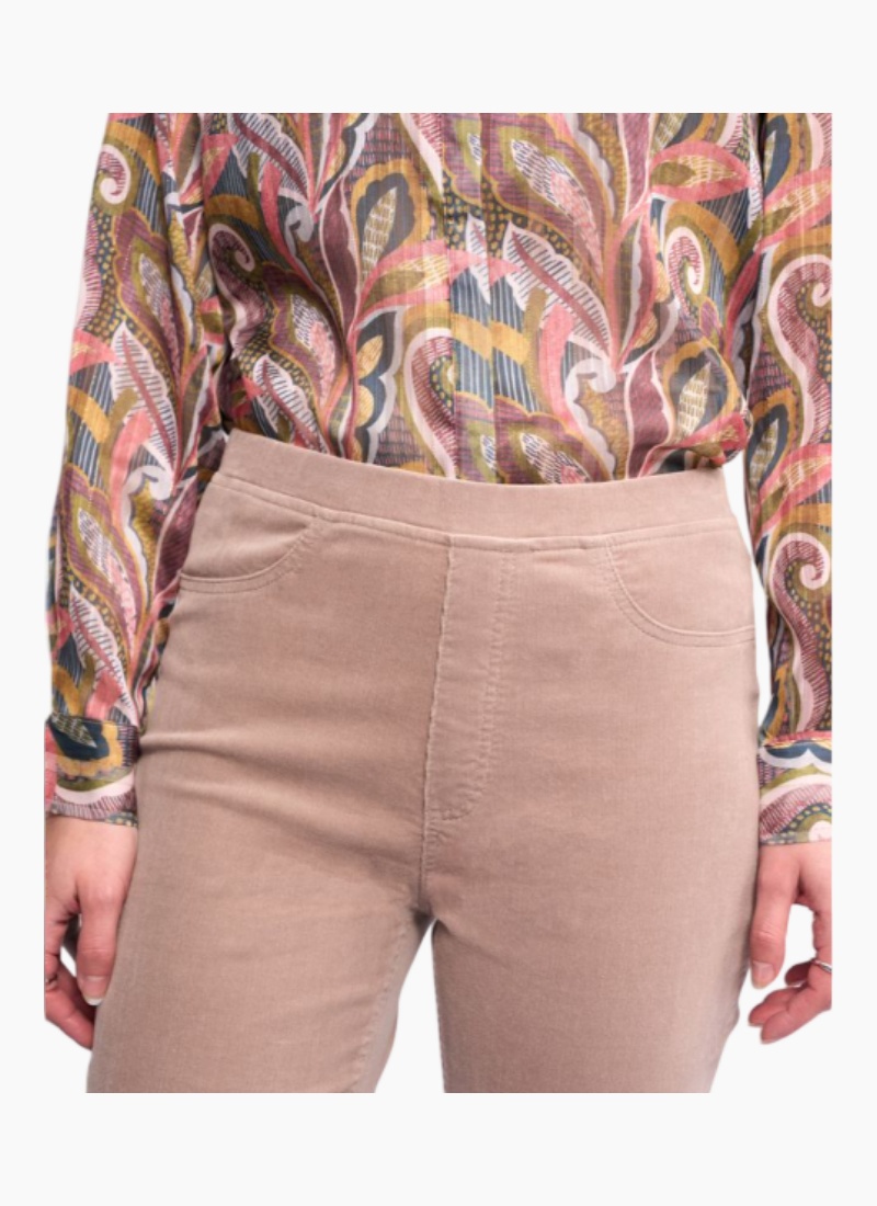 Introducing the Vassalli SLIM LEG FULL LENGTH CORD PULL ON PANT TWIG. A refined everyday pant in soft taupe corduroy that balances comfort with a polished silhouette.