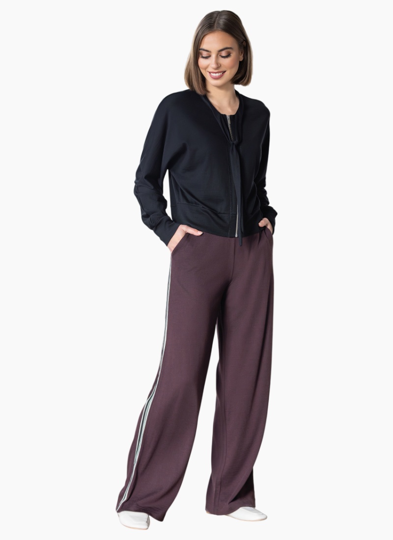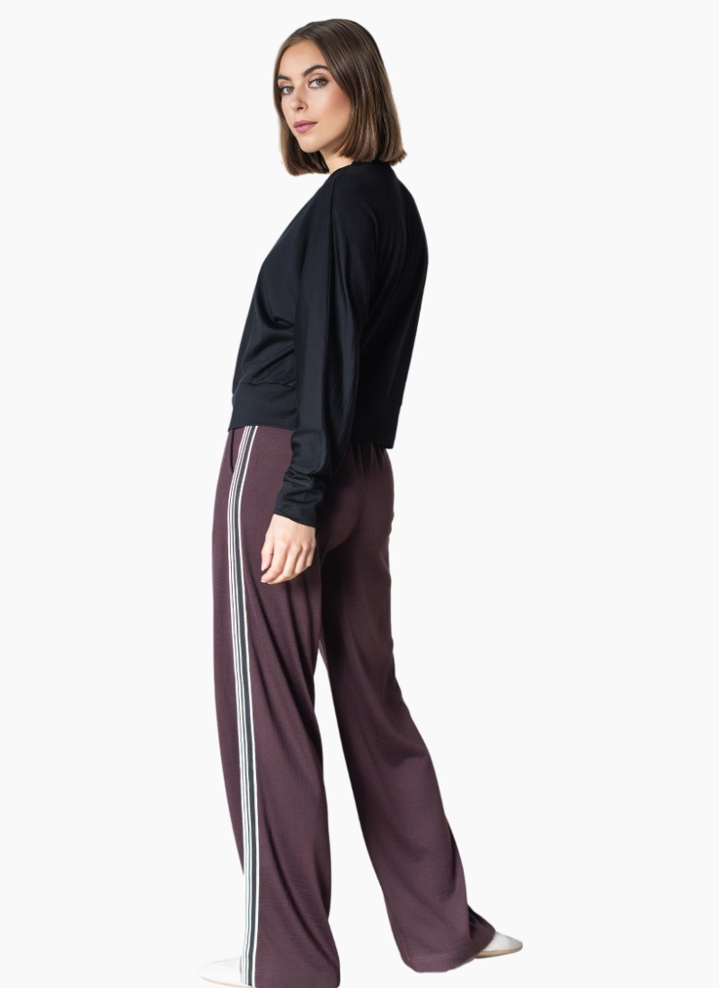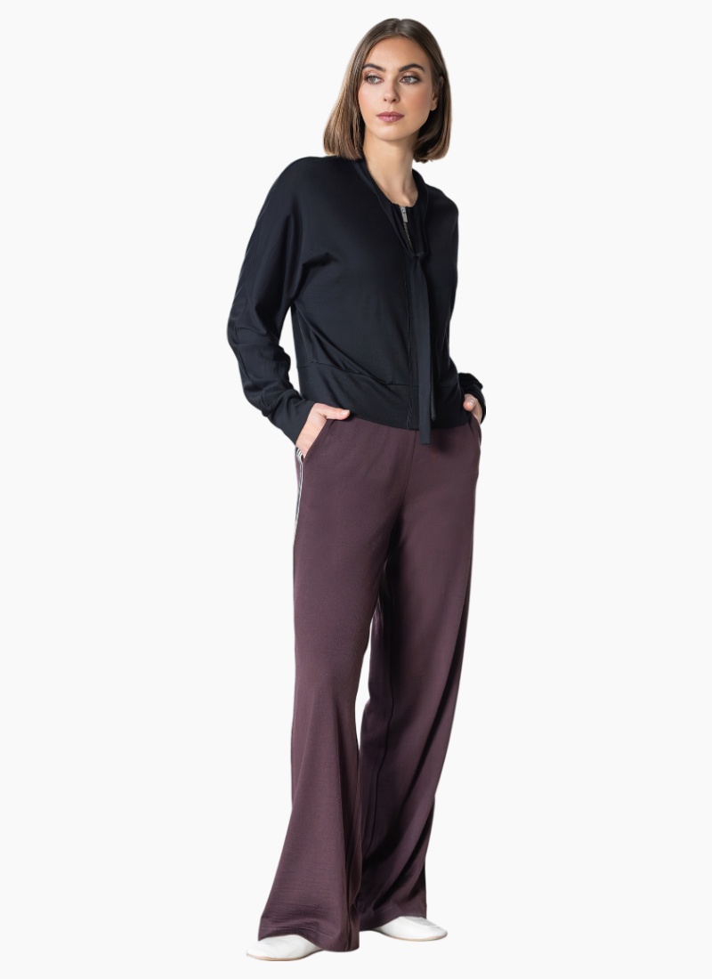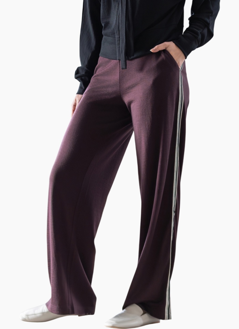 Wide-leg merino pant in Berry — a rich dark plum tone. Designed with a relaxed, flowing shape and a contrast side stripe, this style combines comfort with a clean, modern look for everyday wear.• Made from soft 100% single jersey merino • Elastic back waistband with flat front • Two front side angle pockets • Wide Leg • Contrast stripe tape detail down side seams • Model is 175cm tall, wears size 10 100% Single Jersey Merino