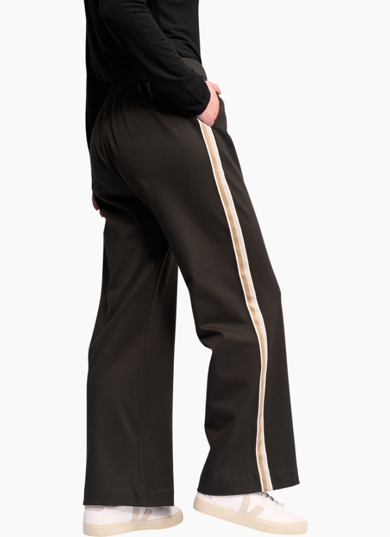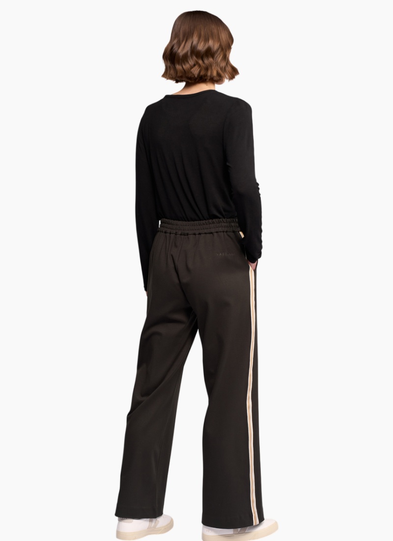 Wide-leg full-length track pant in our Dark Hunter colour — a deep dark green with contrast side stripe detailing. Designed in a comfortable stretch fabric, this style features an easy elasticated waist with adjustable drawstring for everyday wear. A relaxed yet polished take on a classic track pant, complete the set with the matching Weekend Knit Jacket • Wide-leg full length pant with side stripe panel • Made from stretch fabric for the perfect fit • Elastic back waistband with front drawstring featuring metal eyelets and aglets • Two front side angle pockets • 'Vassalli' embroidery below back waist on wearers right-hand side • Contrast stripe tape detail along side seams • Model wears size 10