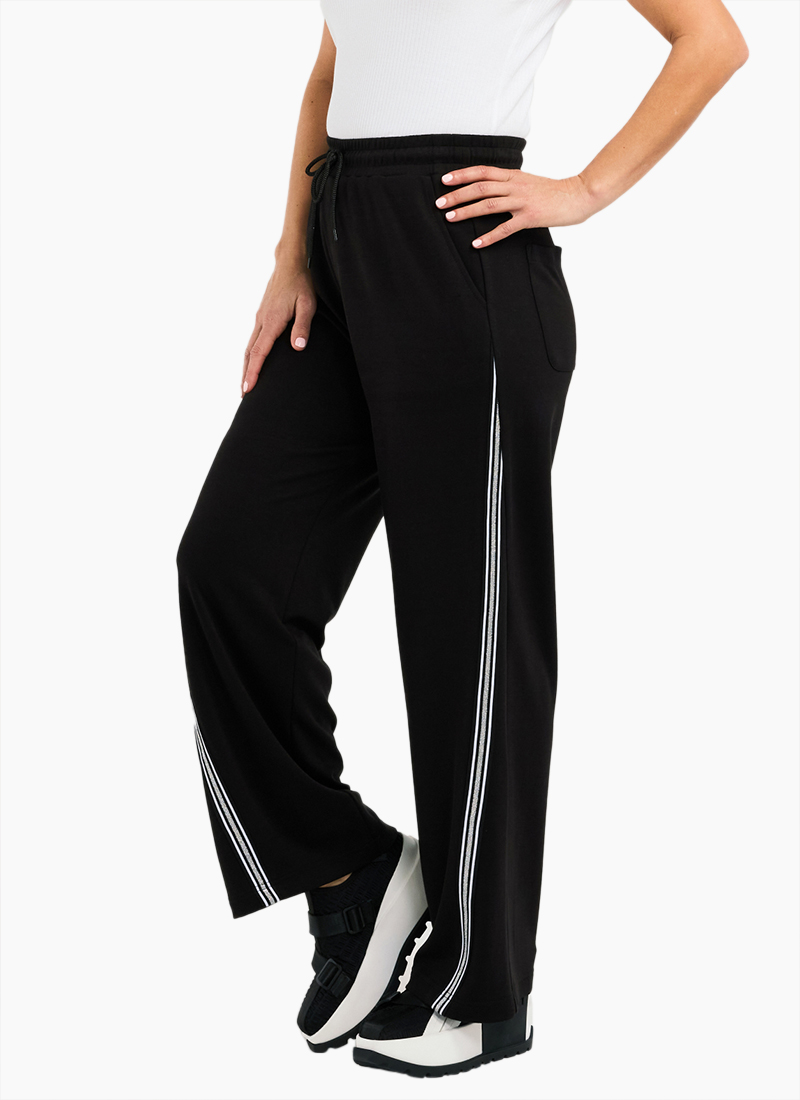 These cream pants feature an elasticated waist with a drawstring for a comfortable, adjustable fit. The white striped trim on the sides enhances the silhouette, while pockets add practicality blending comfort with effortless style.