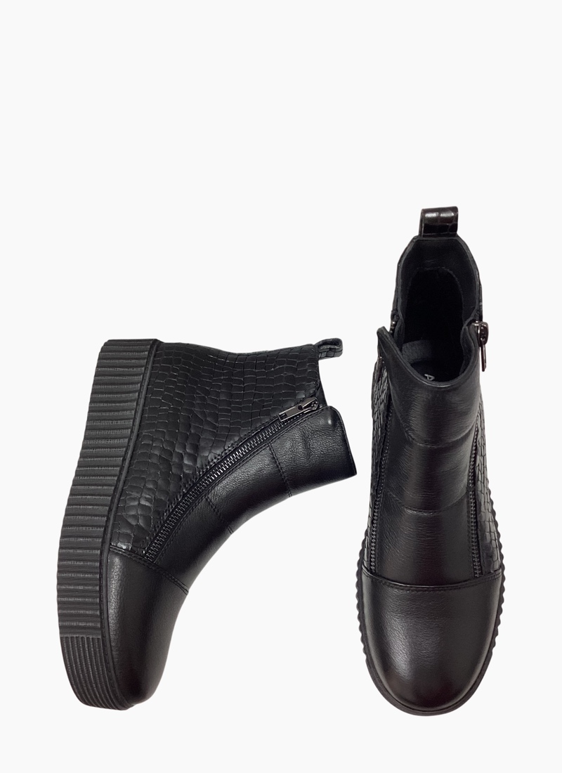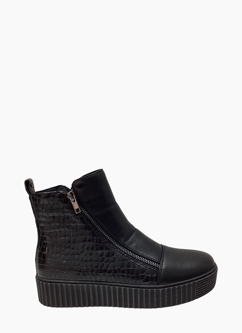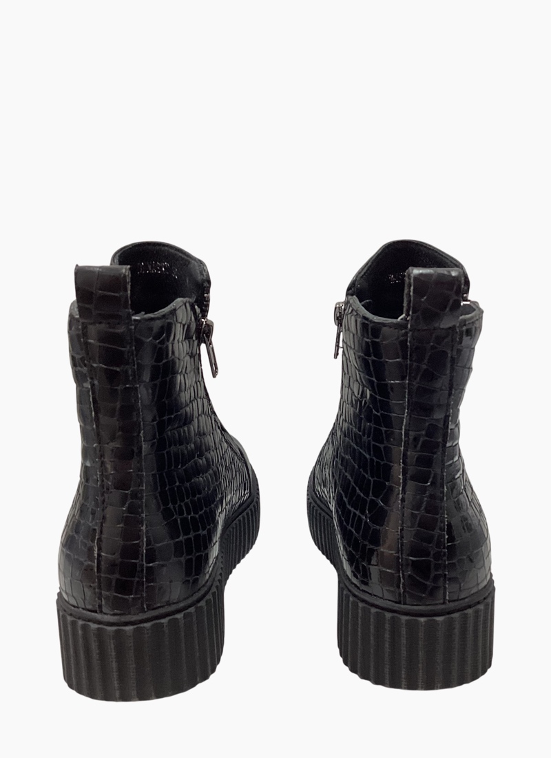 - Crafted from smooth black leather with croc-embossed panels for tactile interest
