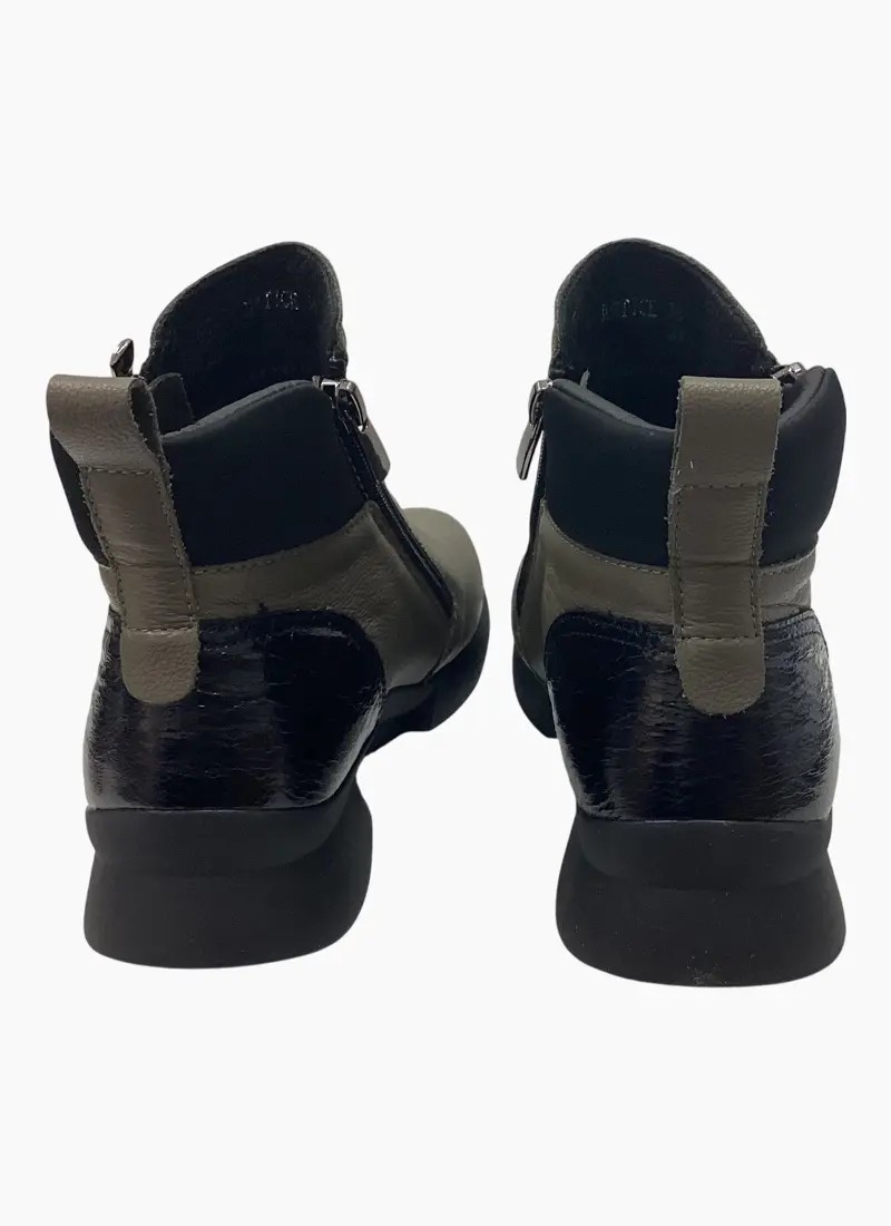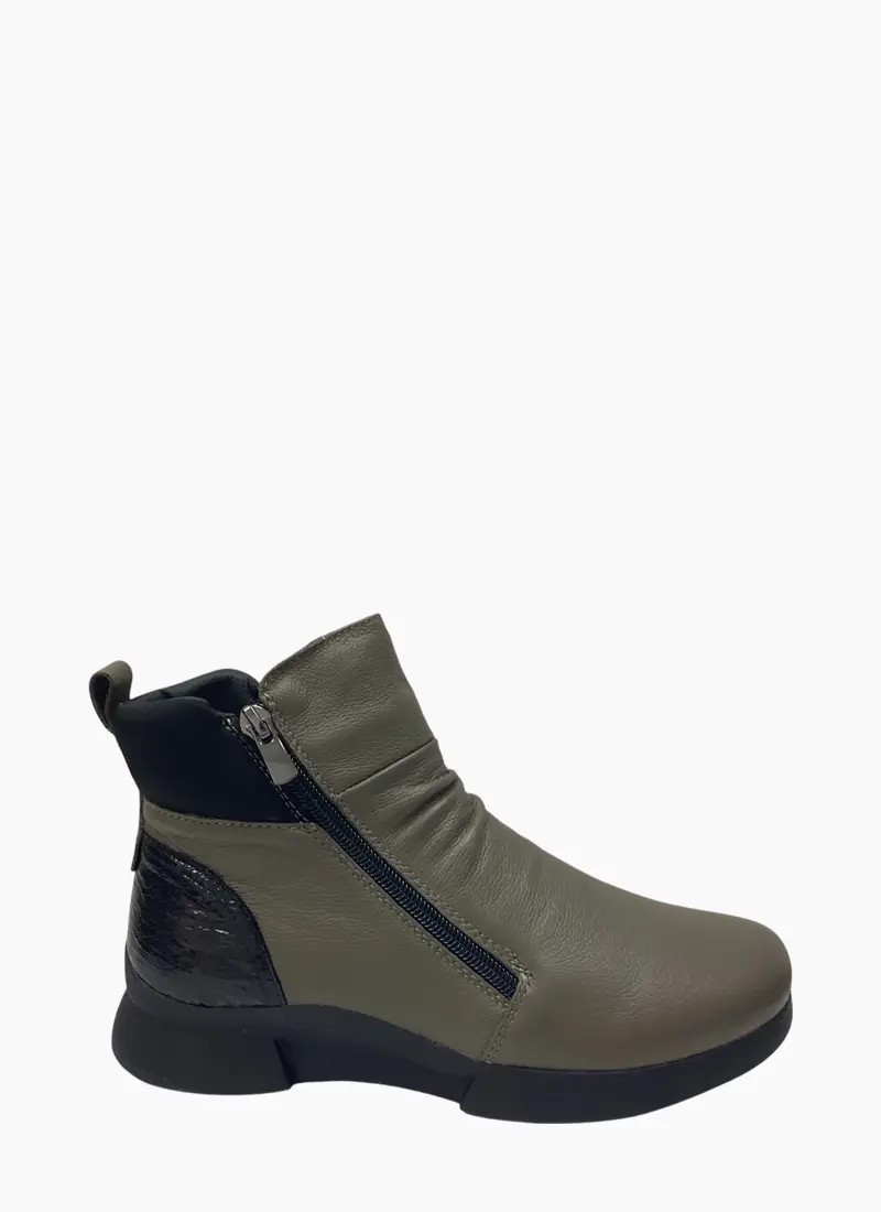 Sweet low classic chelsea boot in Khaki leather with Black Glossy accent on the heel. Double zip for easy off and on plus black neoprean like collar round the back of the boot. Glossy black heel accent