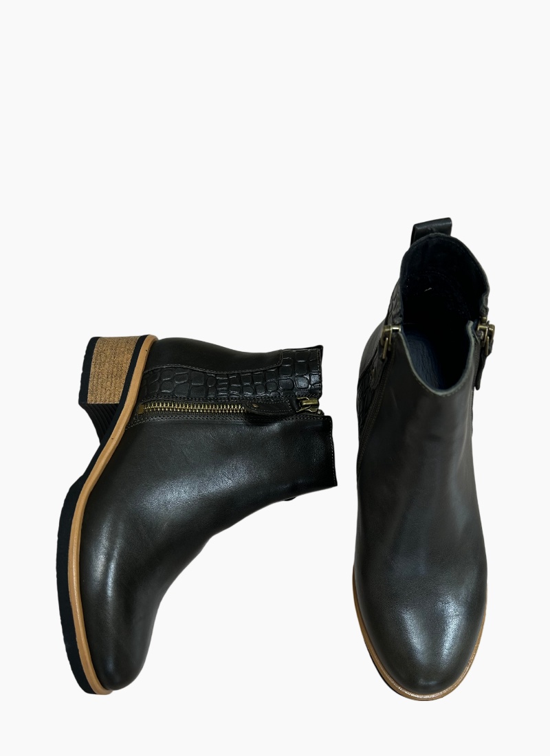 Introducing the Dinx Ankle Boot from Bresley. This refined ankle boot pairs a deep forest leather upper with a stacked heel for a contemporary, versatile look.