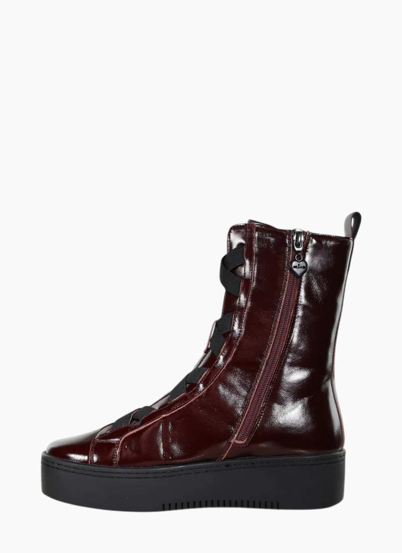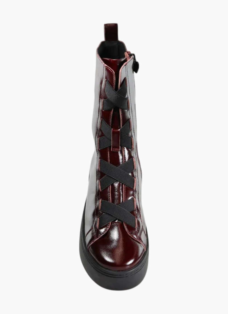 Introducing the KATERINA Sneaker Boot from Minx in Choc Cherry. This contemporary ankle boot brings a polished, street-ready edge to your wardrobe with a glossy finish and confident silhouette.