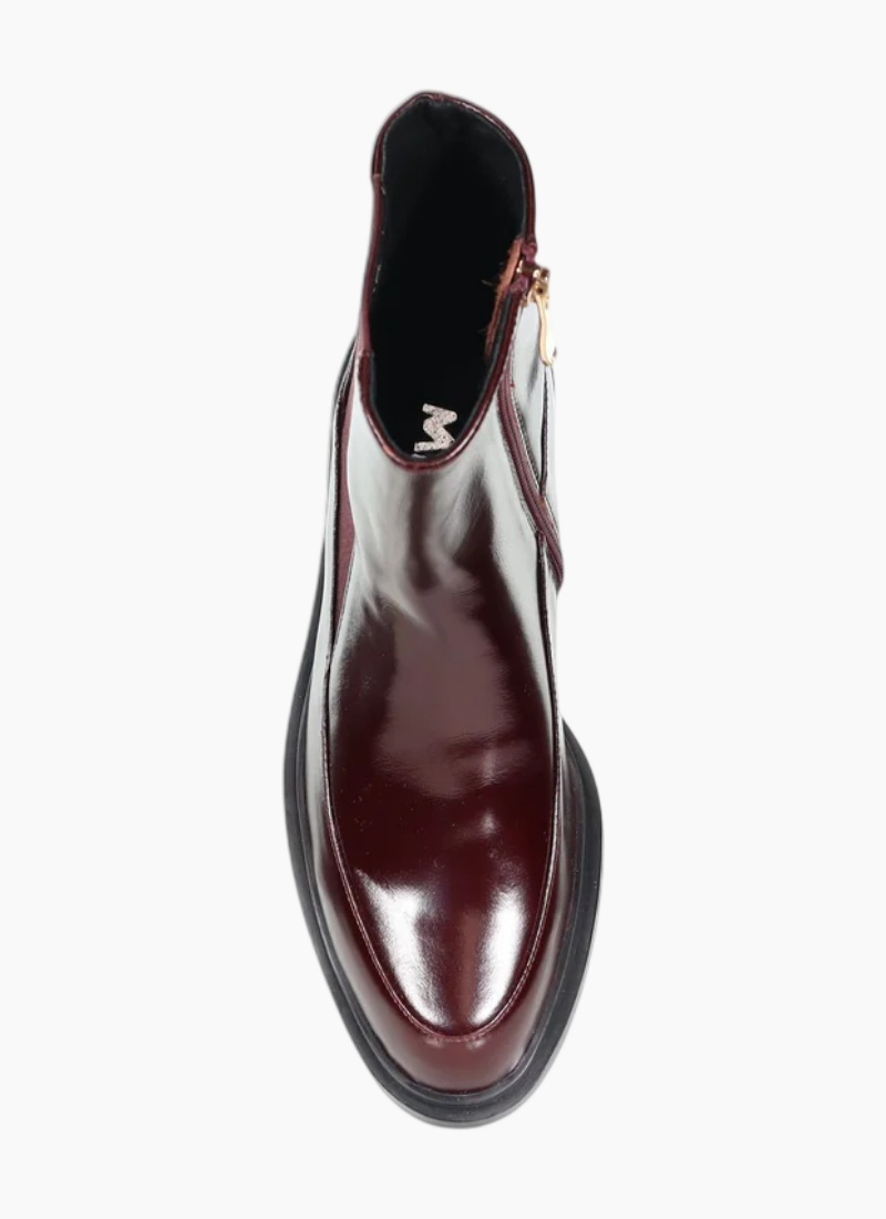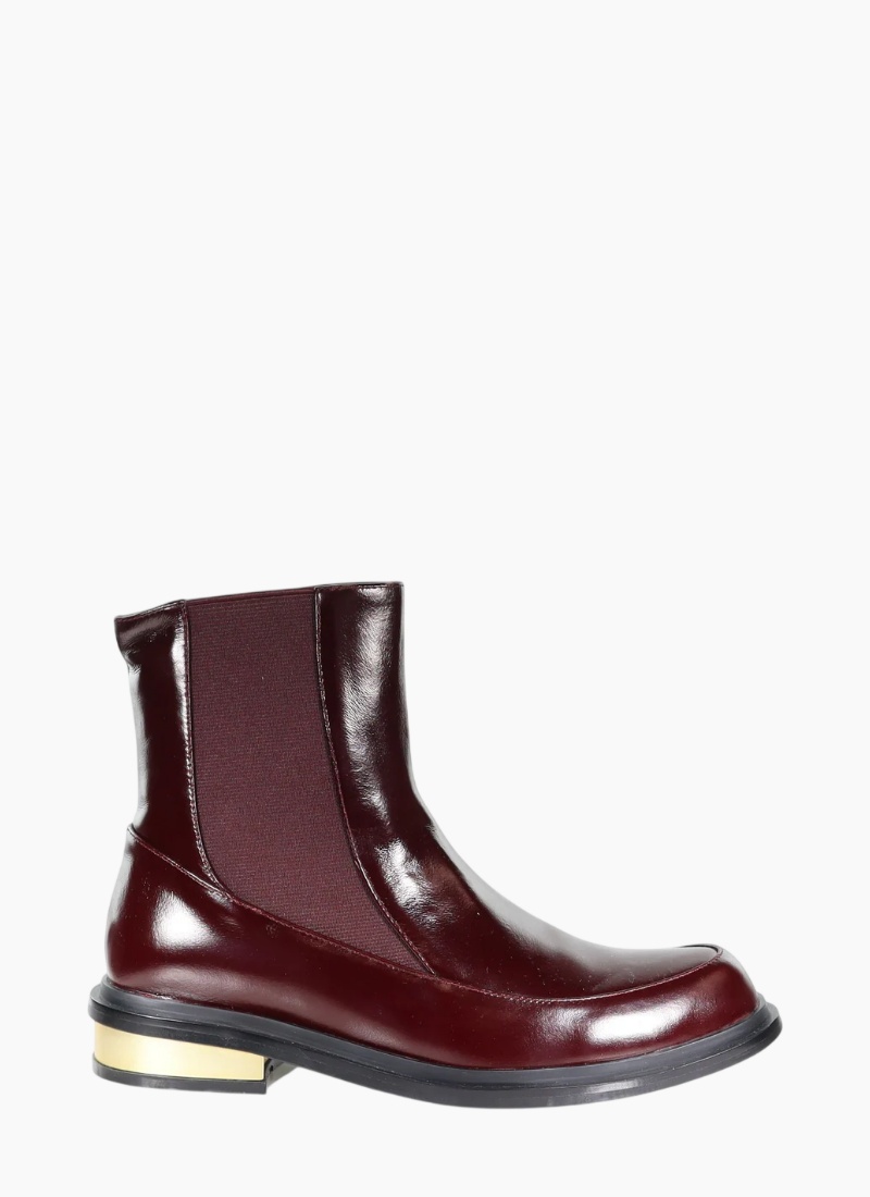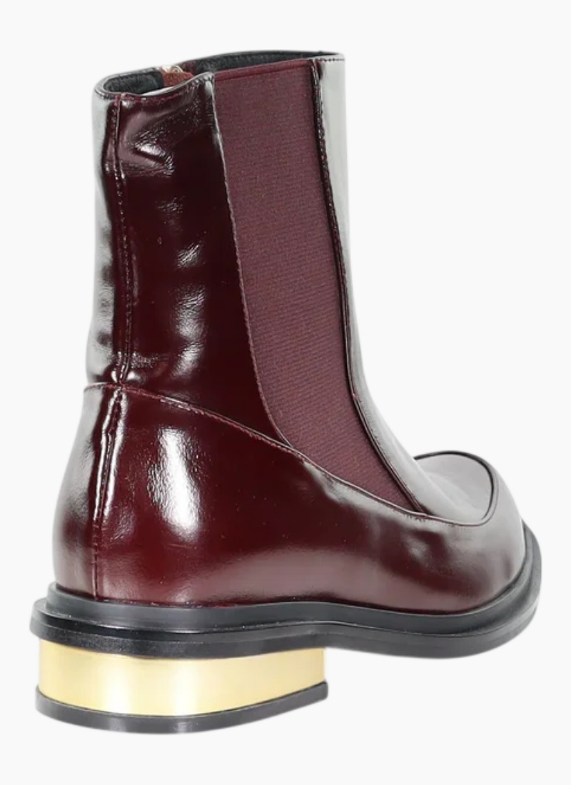 Slone is a refined ankle dress boot designed to elevate your winter wardrobe. Crafted with a sleek silhouette, it features a rounded square toe and classic apron front detailing for a sophisticated finish. The standout gold feature block stacked heel adds a touch of statement shine, while an inside zipper and elastic gusset ensure an easy fit and comfortable wear. Sitting just above the ankle, Slone pairs beautifully with tailored trousers, skirts, and dresses, making it a polished, high end addition to your seasonal looks.
