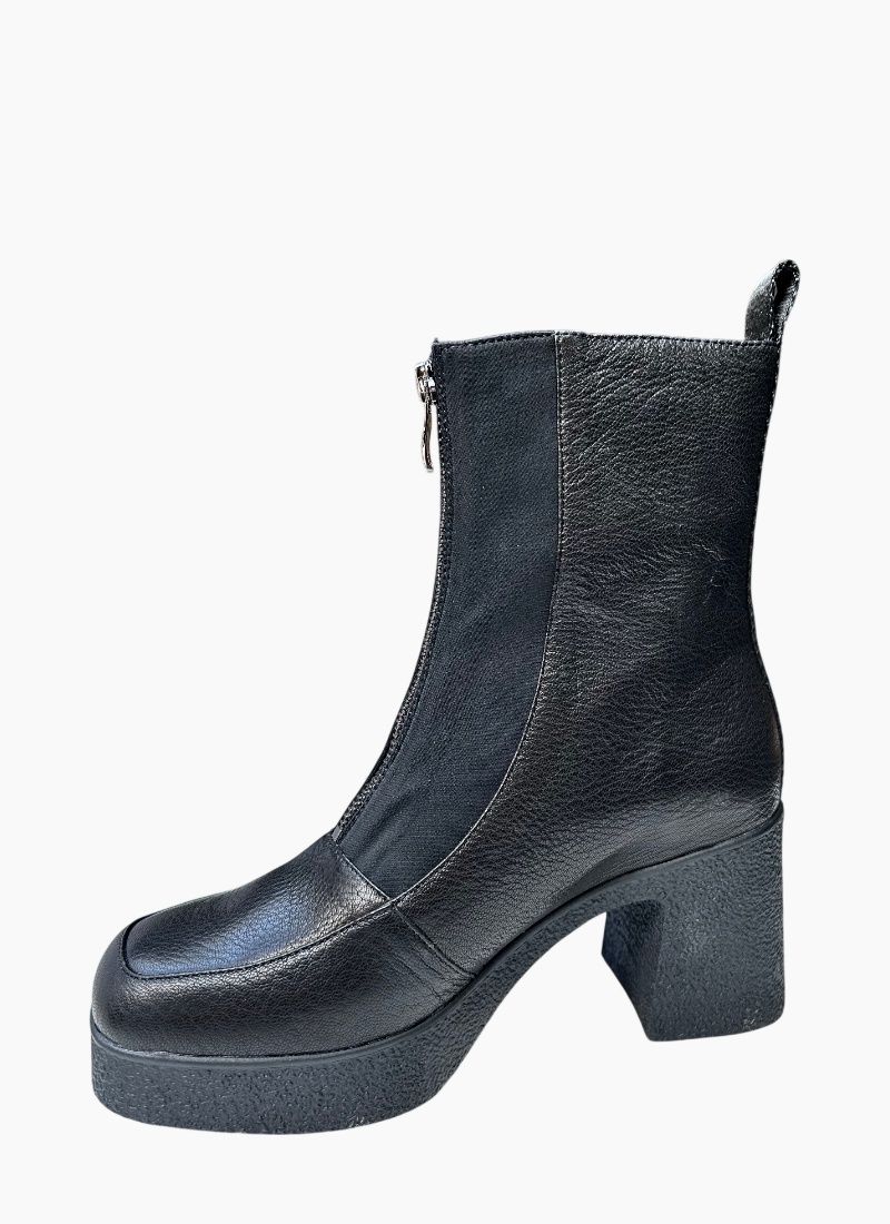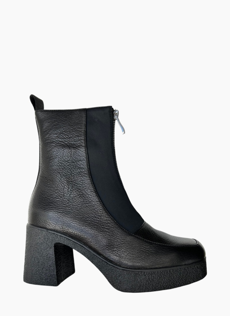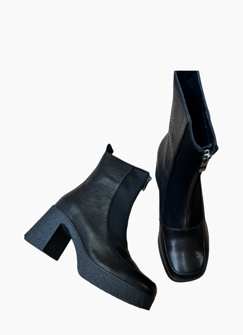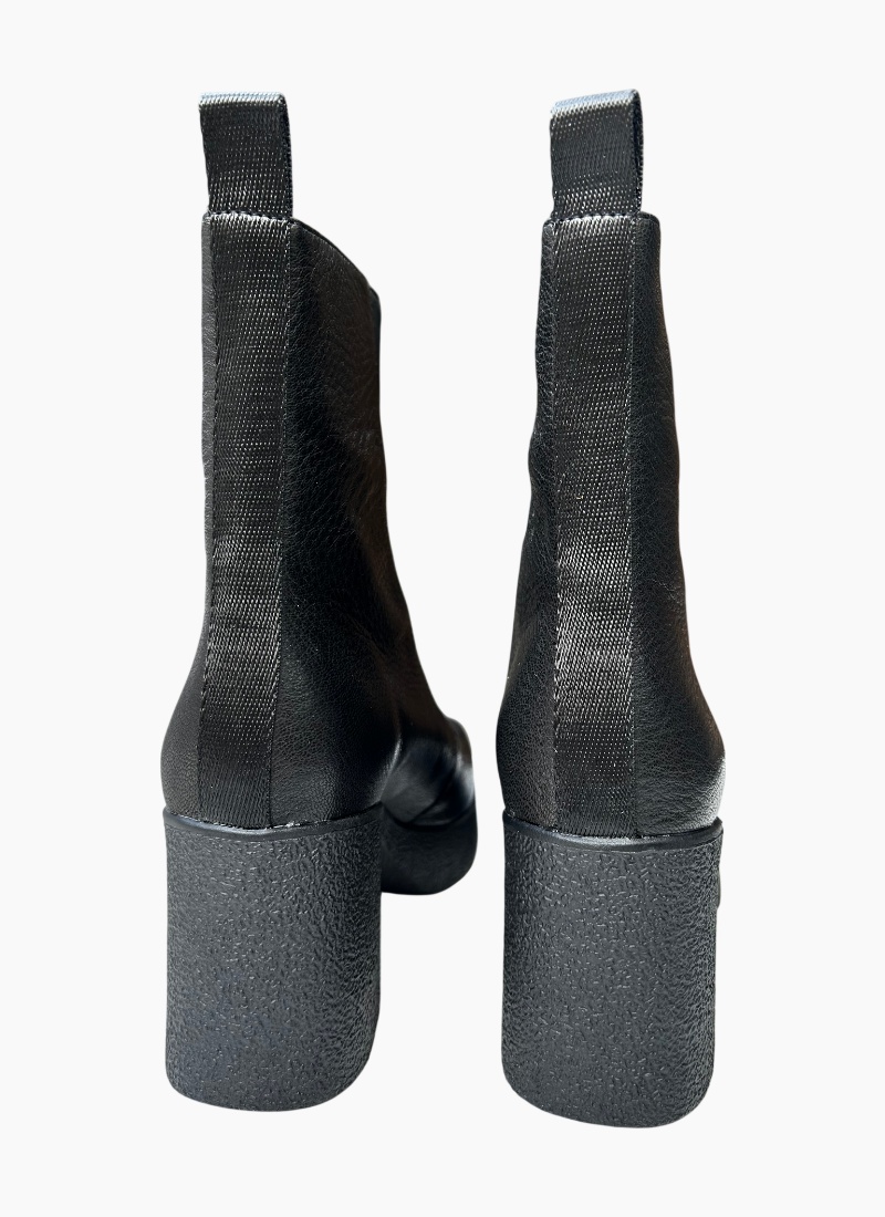 Introducing the Bleacher Ankle Boot Black from Tamara London. A sculptural ankle boot that pairs a textured black leather upper with a chunky platform sole for a modern, confident look.