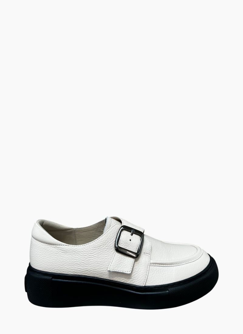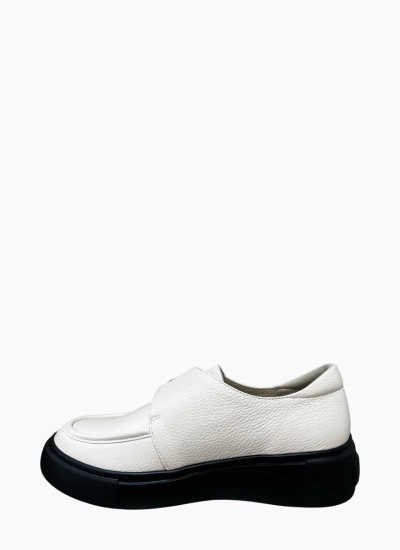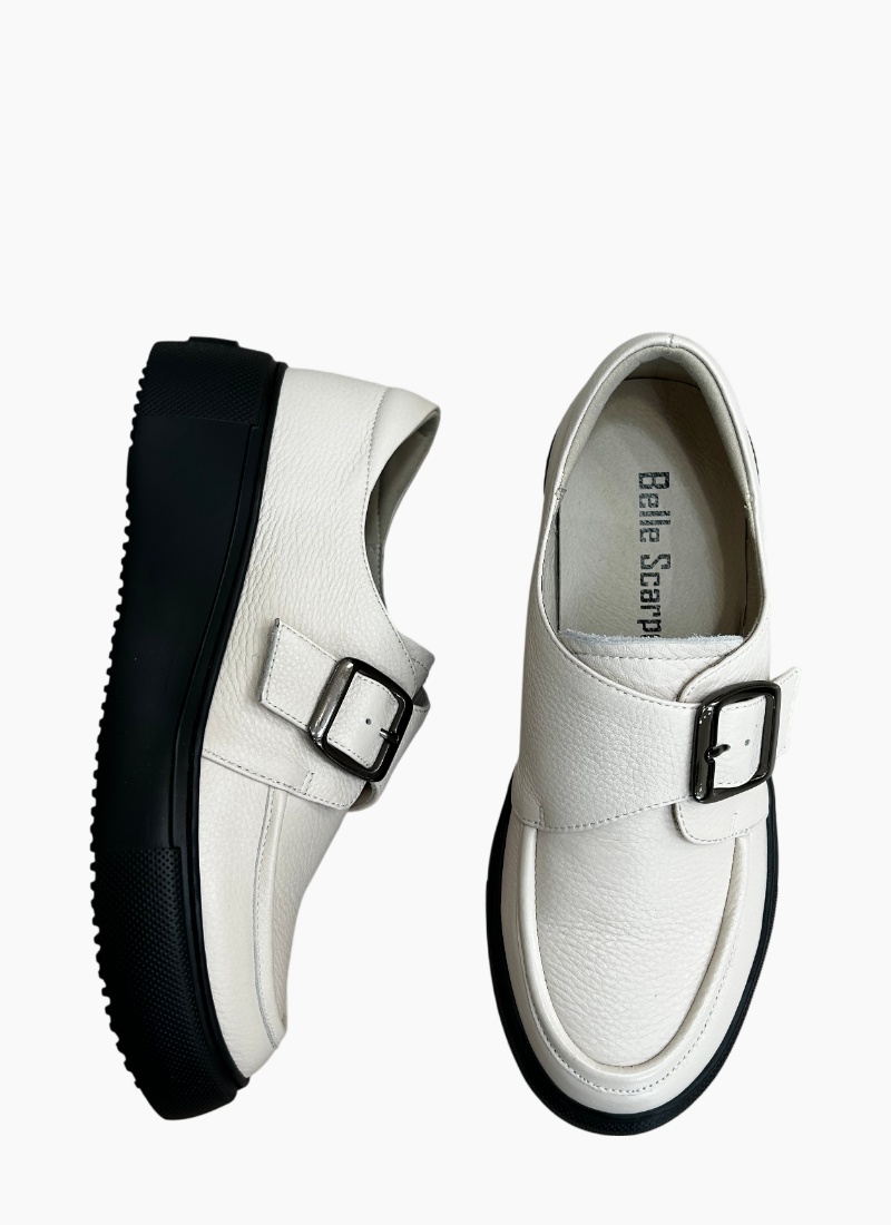 Introducing the Ragdoll Bone/Black sole from Belle Scarpe. A contemporary velcro opening flat that pairs a bone leather upper with a chunky black sole for a modern, polished look.