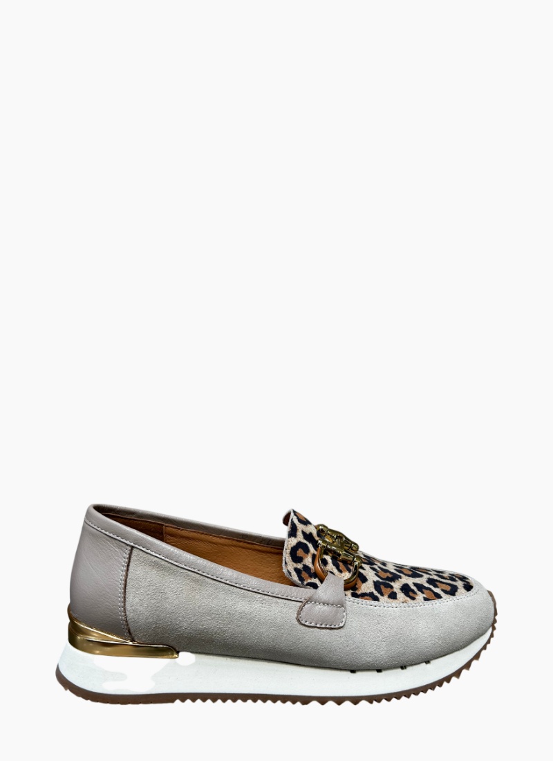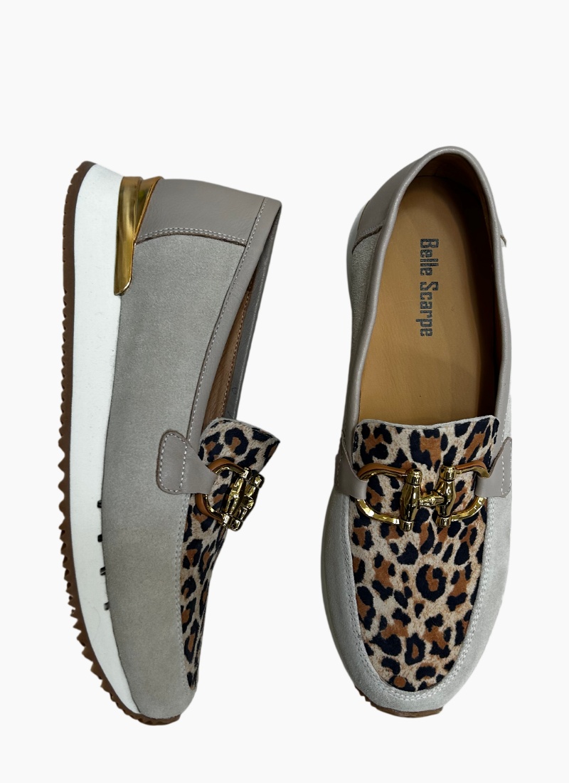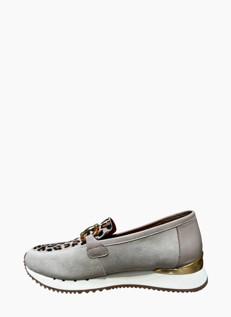 Introducing the Rebekah Loafer from Belle Scarpe. A refined taupe flat that balances classic loafer lines with contemporary sporty details.