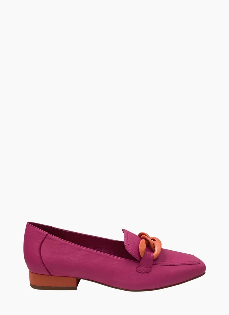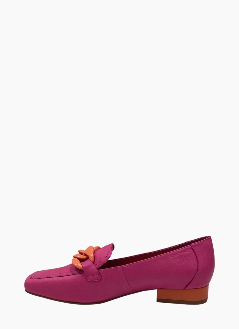 - Supple leather upper in vibrant fuchsia with a contrasting orange resin chain and heel detail
