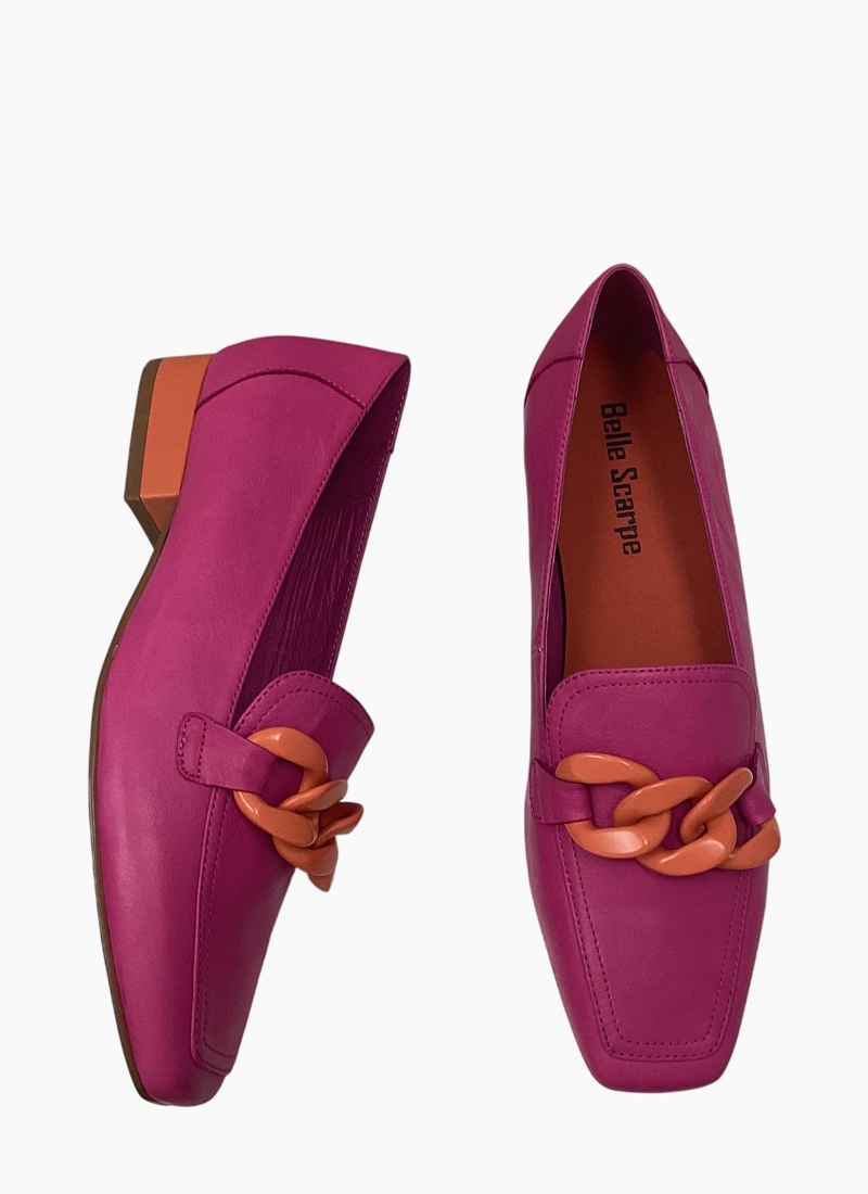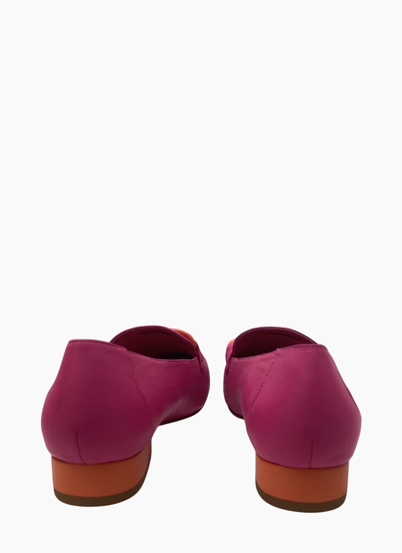 Introducing the Roam Shoe Fuxia/Orange from Belle Scarpe. This chic leather flat brings a bold pop of fuchsia with a playful orange accent to everyday dressing.