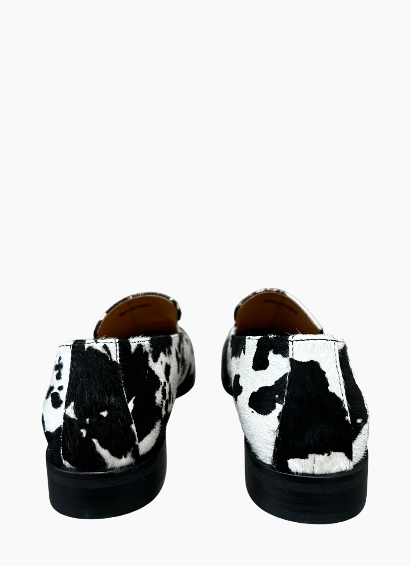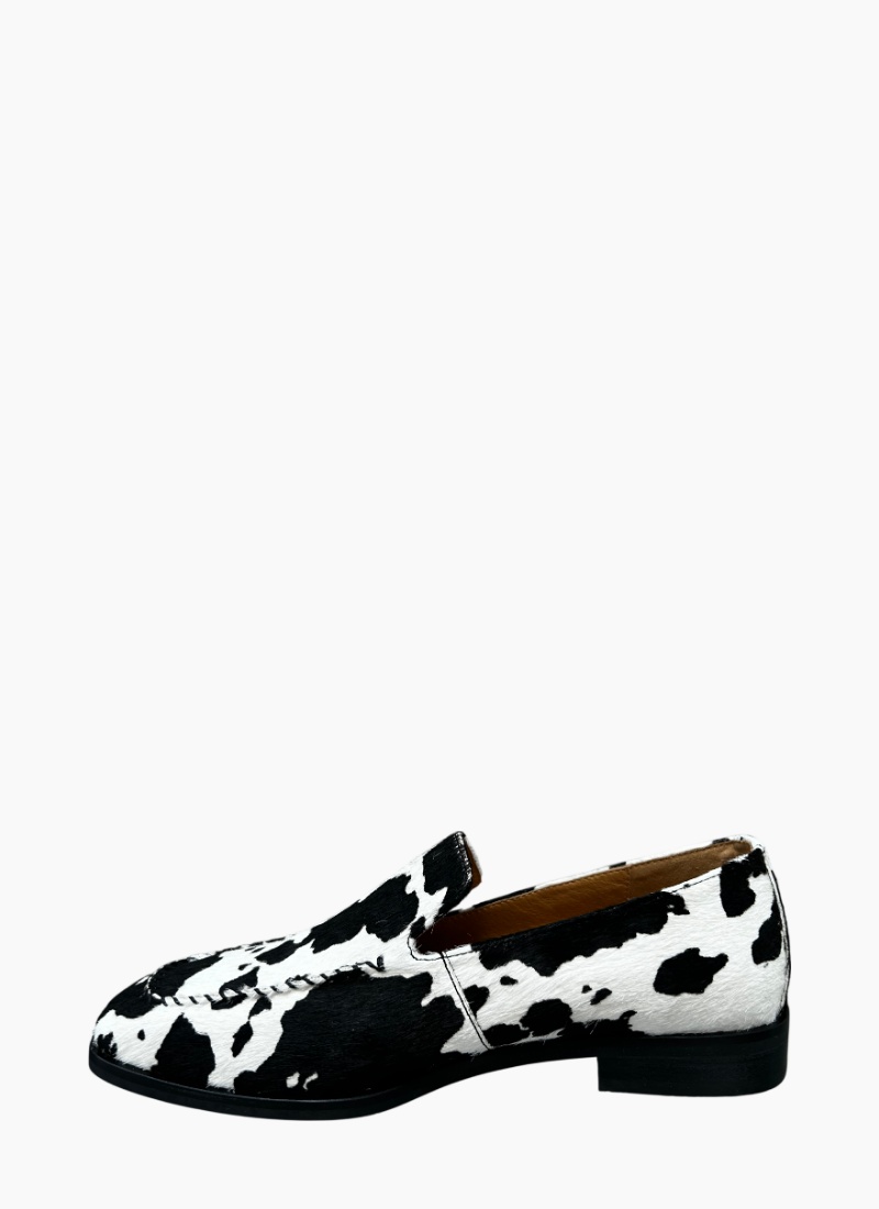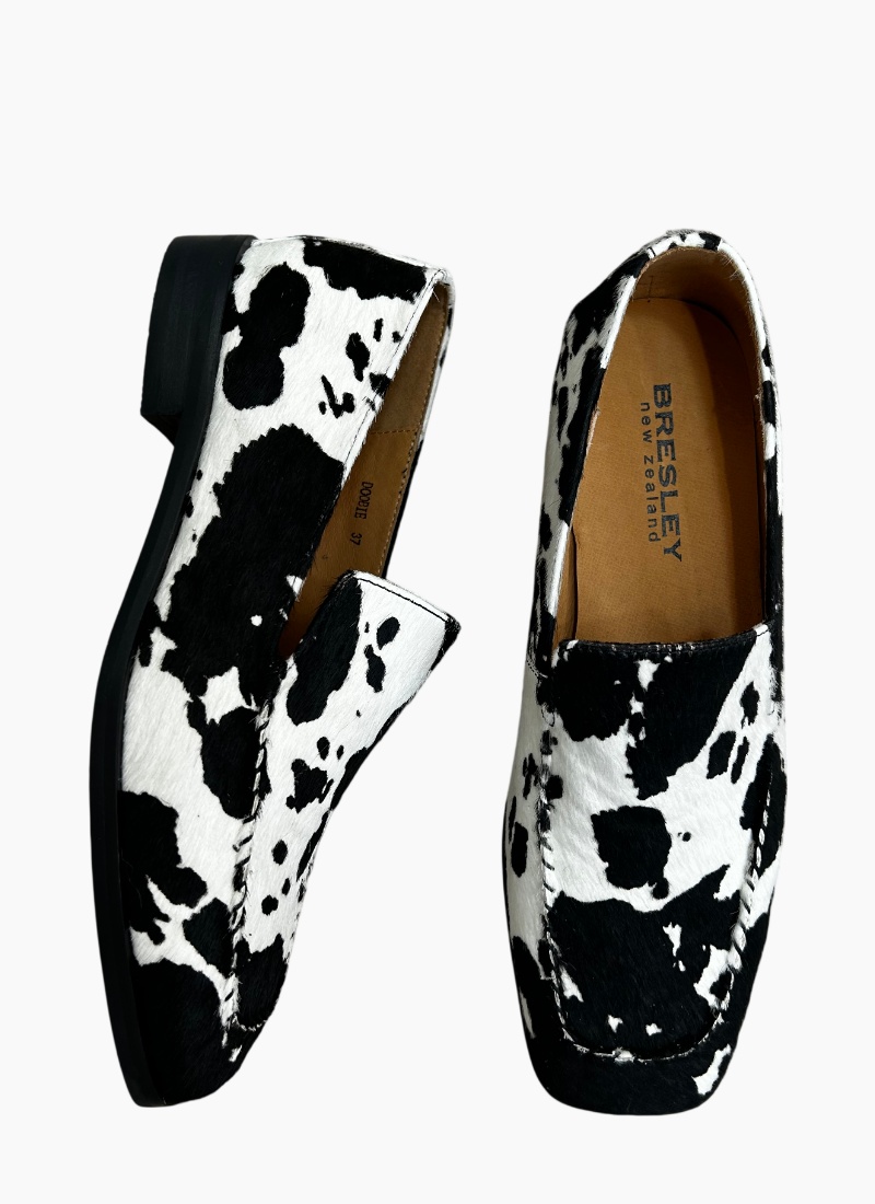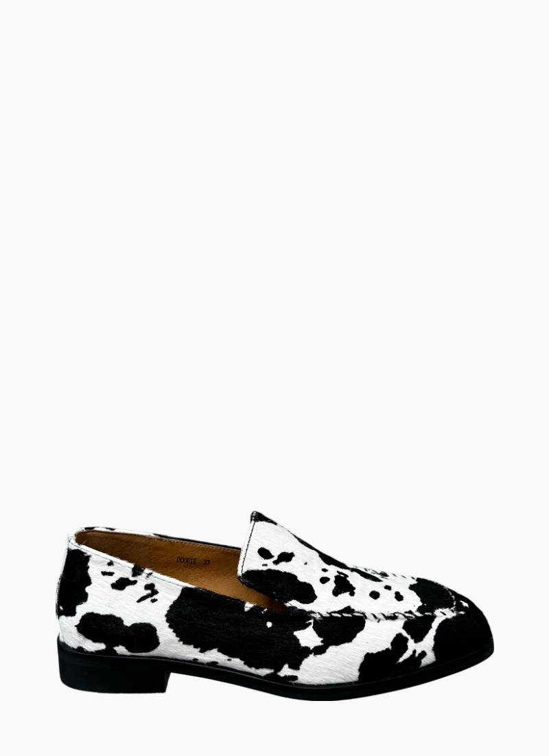 Introducing the Doobie Loafer by Bresley. This striking black and white cow-print loafer is a modern take on a classic flat, crafted in hair-on cowhide leather for tactile appeal and statement-making style.