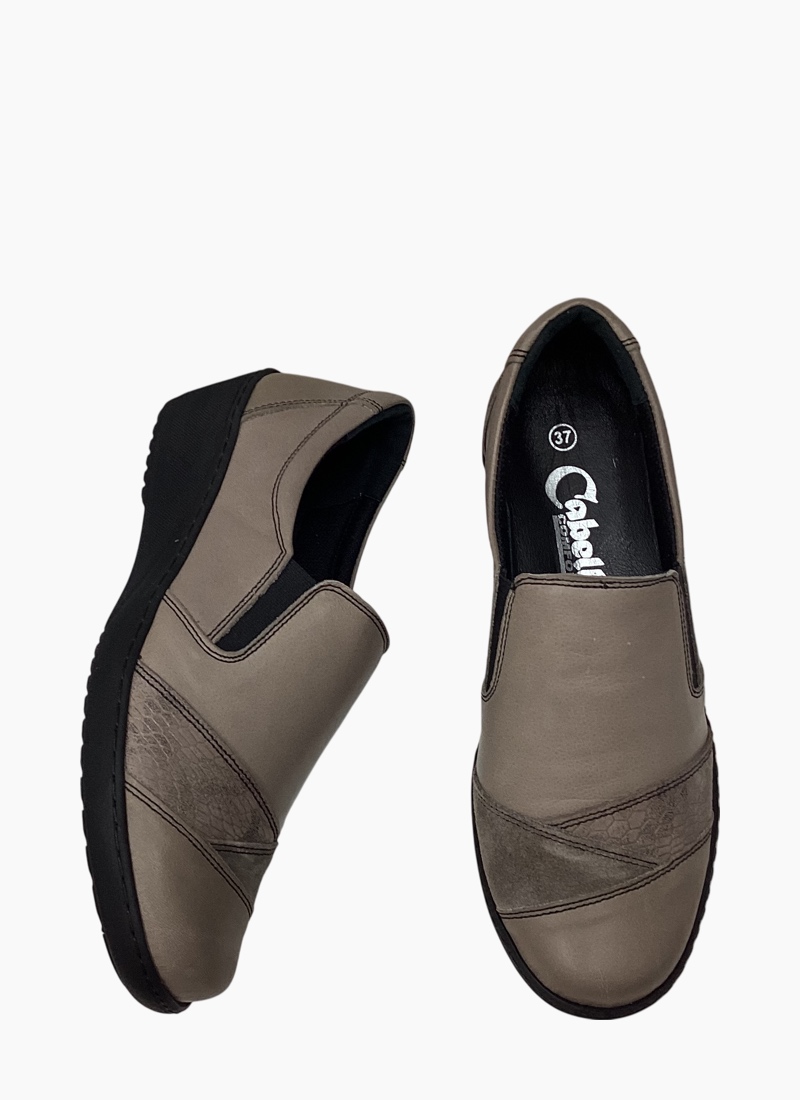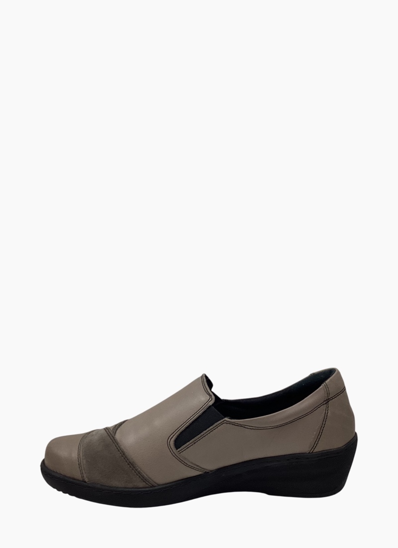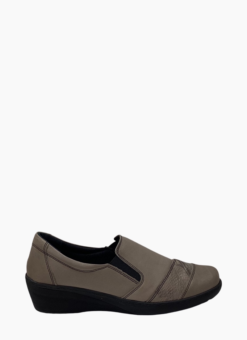The CP736-18 lightweight slip-on shoe features detailed leather uppers and elastic gussets at the top of the foot to ensure a snug fit. The padded footbed provides all day comfort and the low wedge makes this shoe a stylish choice for either day or night wear.