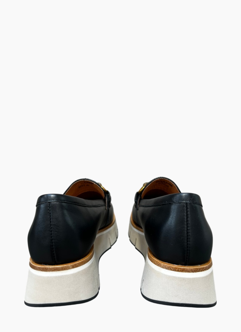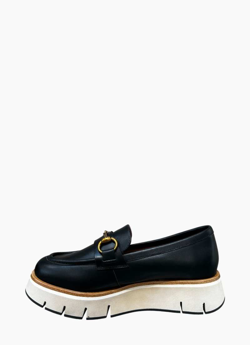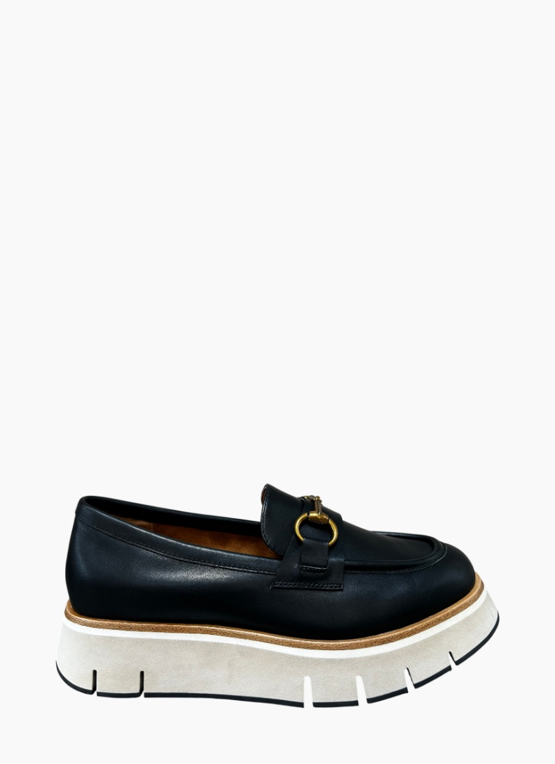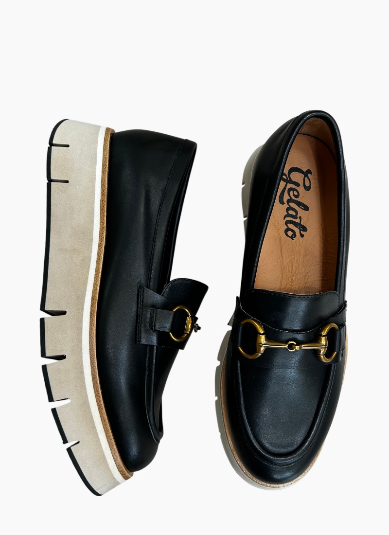 Introducing the Oppo Platform Loafer Black from Gelato. A modern update to a timeless silhouette, this loafer pairs smooth black leather with a bold, elevated sole for contemporary polish.