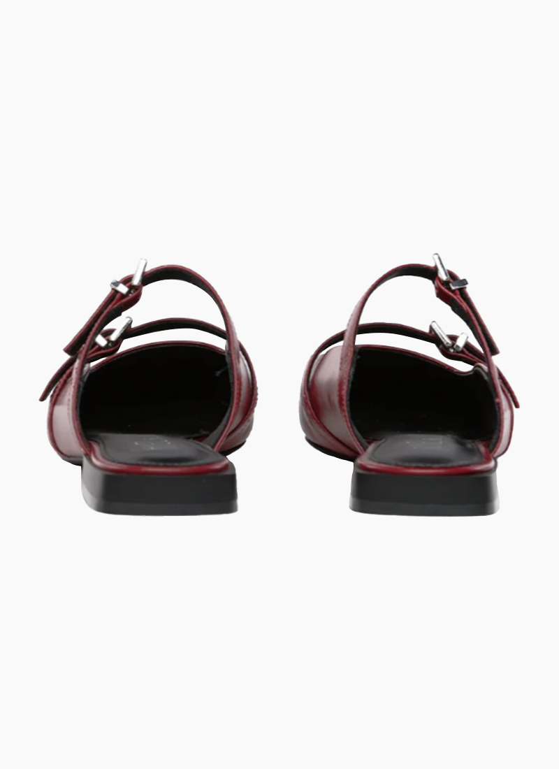 The Pollock pointed flat is a mule-style shoe featuring elegant fine straps adorned with brass gold buckle details.