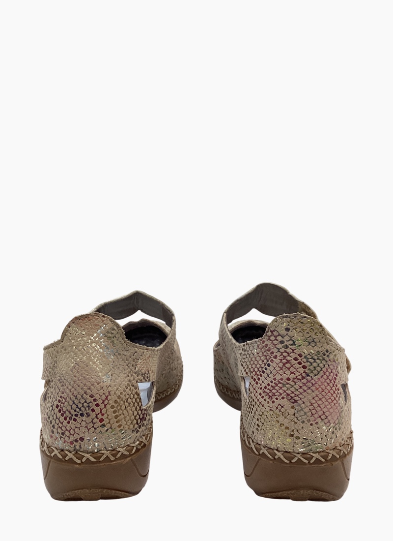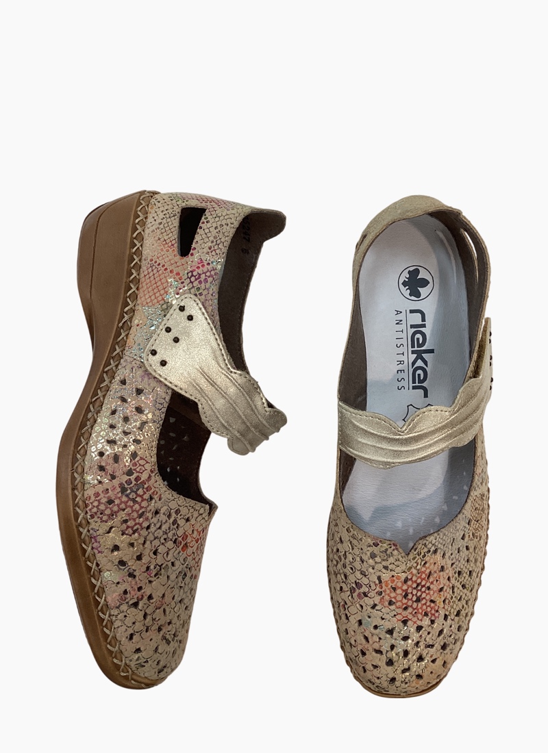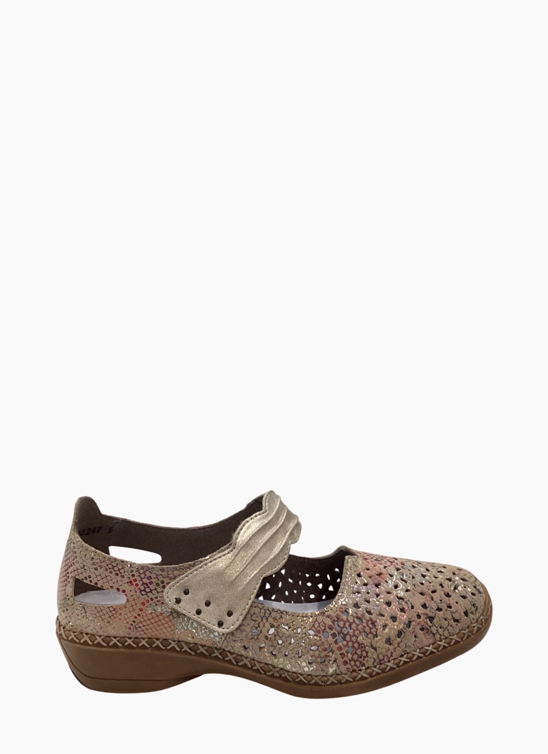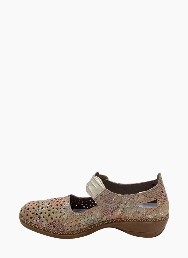 Introducing the Rieker 41399-92 Mary Jane Beige Combo. This elegant everyday flat blends comfort and feminine detail.