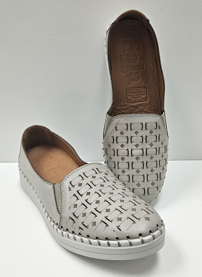 LAZY by SALA is a casual women's flat designed for easy style and comfort. This slip-on shoe features twin elastic gussets for easy wear, while a slightly wedged sole provides a subtle lift. The leather upper showcases a detailed pattern on the forefoot and is accented with blanket style stitching around the exterior connecting the upper to the sole. Versatile and easy to wear, LAZY is the perfect addition to any casual wardrobe.