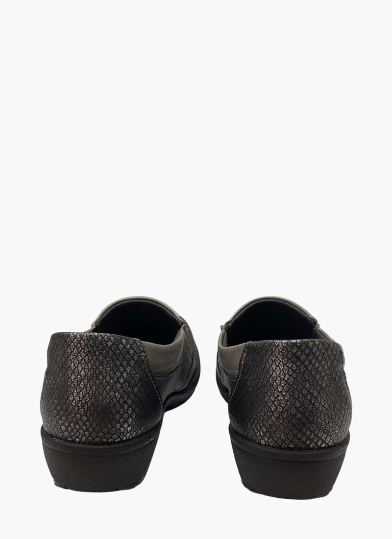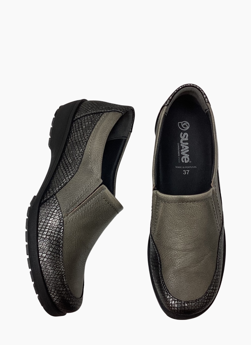 Introducing the Eldora Shoe Barrel/Snake from Suave. This refined slip-on shoe marries olive leather with metallic snake-print panels for a polished, contemporary finish.