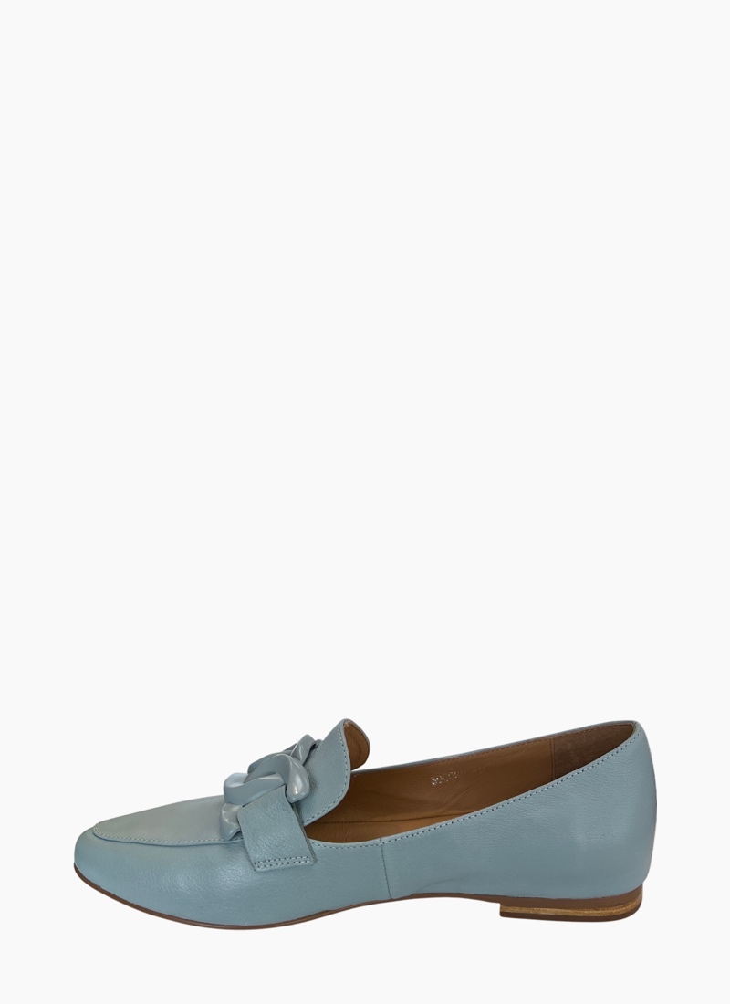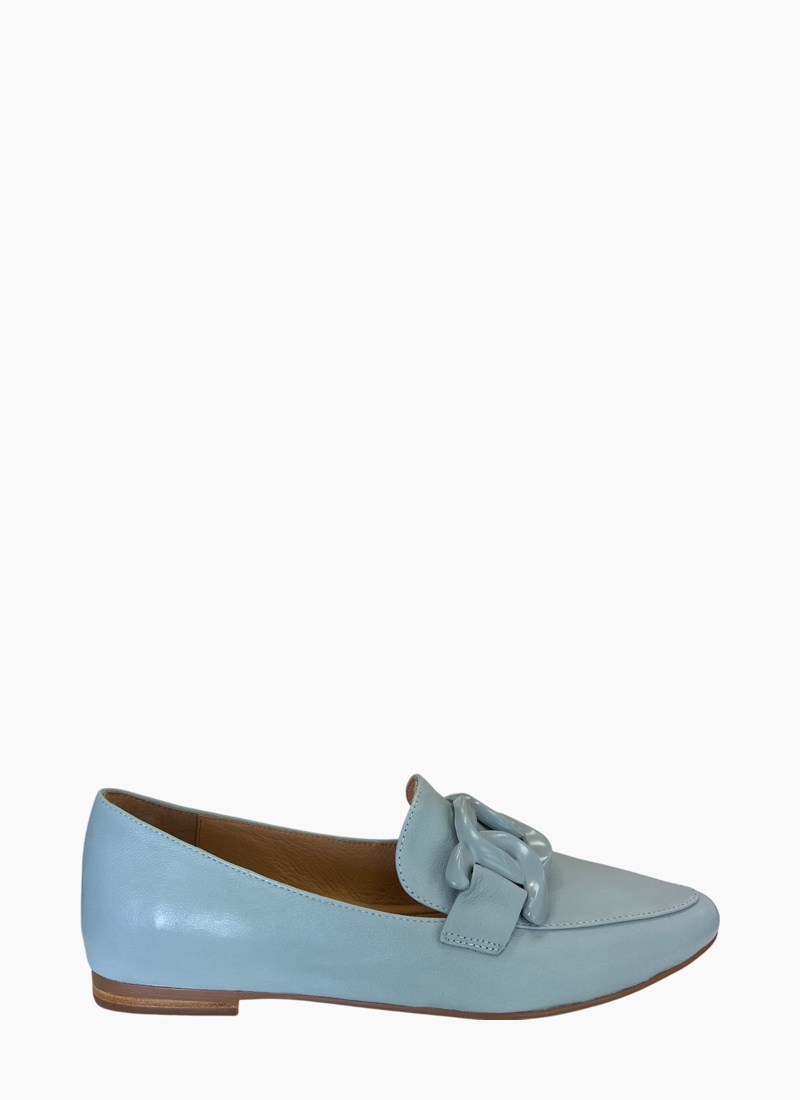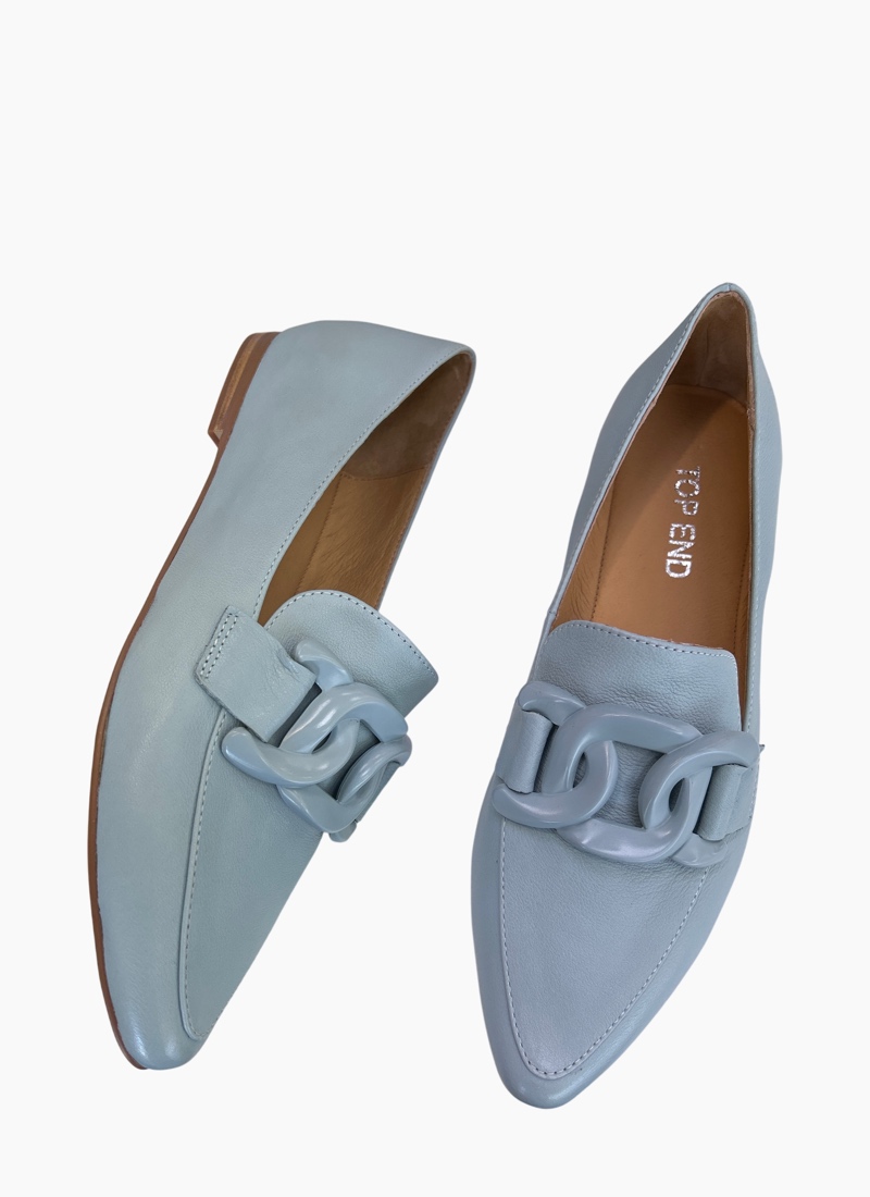 Introducing the Socoros Loafer Denim from Top End. A refined powder-blue leather flat that lifts everyday looks with quiet elegance.