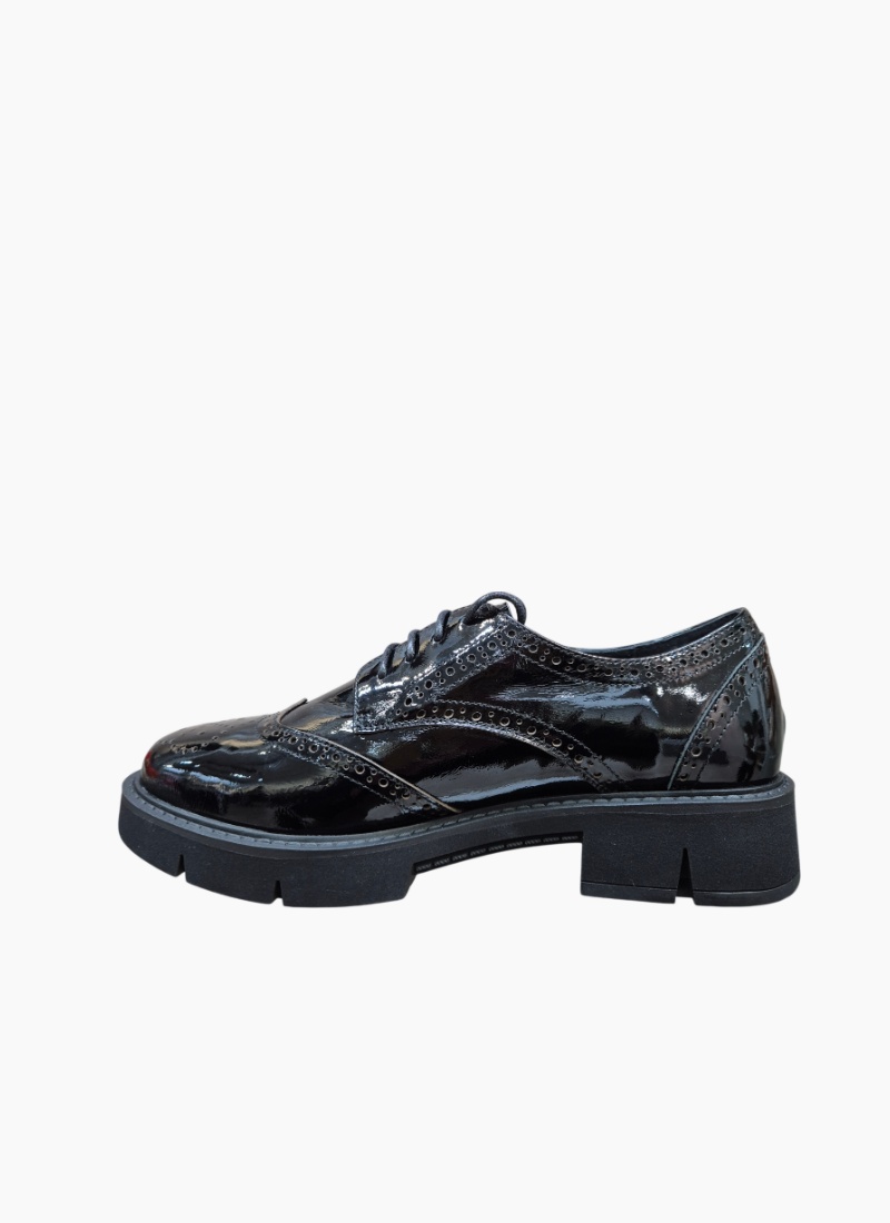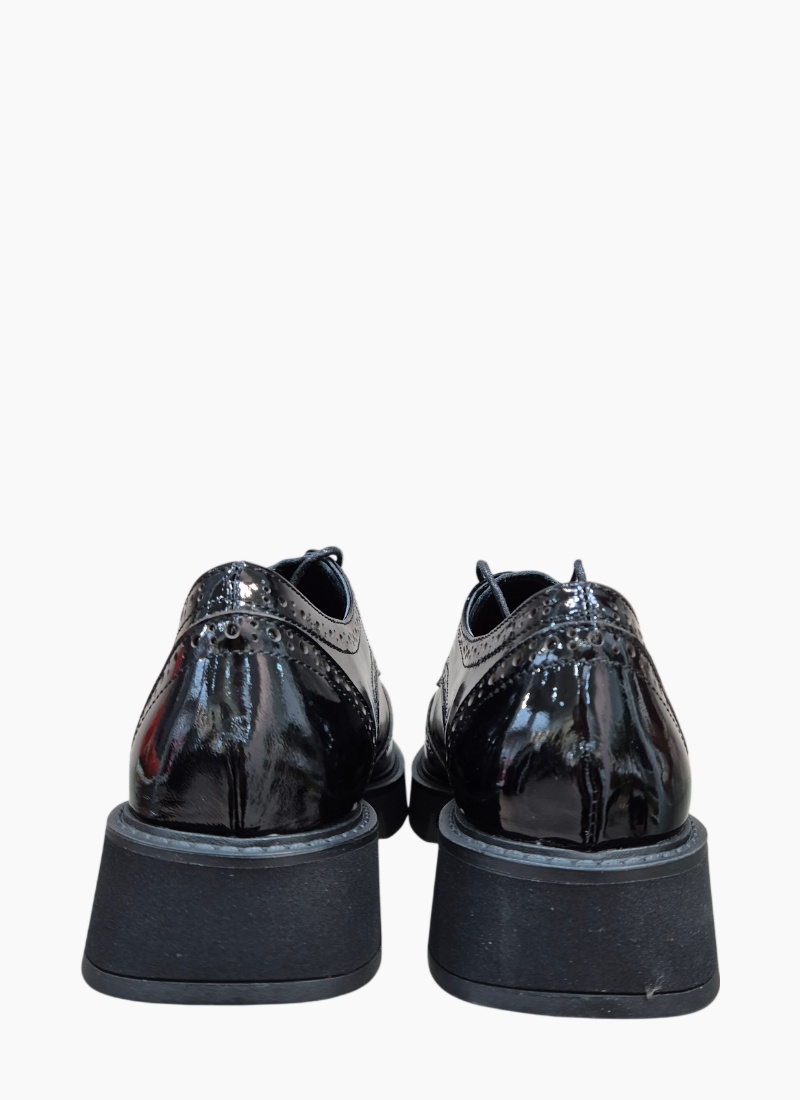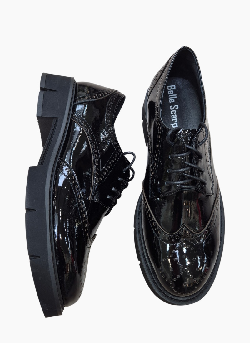 Introducing the Redmond Shoe Black Patent from Belle Scarpe. This glossy brogue-inspired heel fuses classic tailoring with a contemporary block platform for polished, confident dressing.