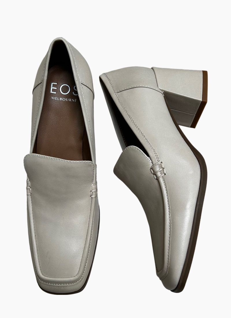 Introducing the EOS Verde Heel Birch. The Verde Heel Birch from EOS is a refined block-heel loafer that brings a quiet, modern elegance to your wardrobe.