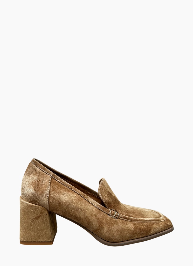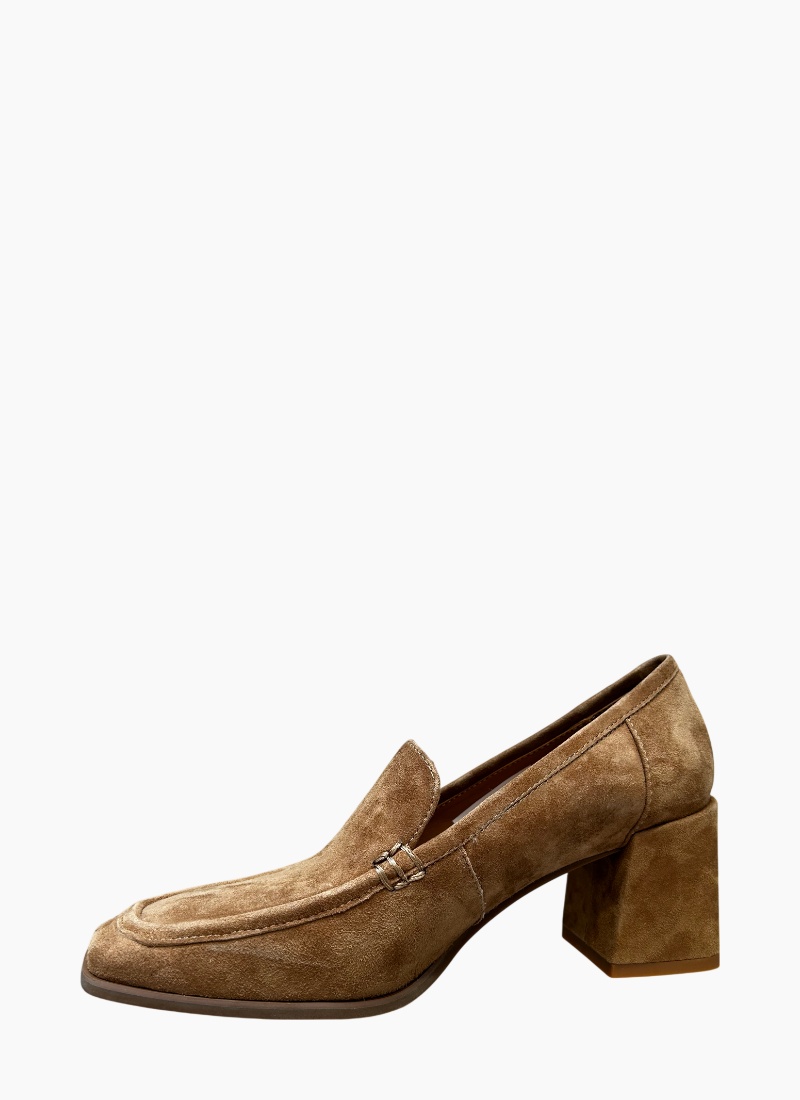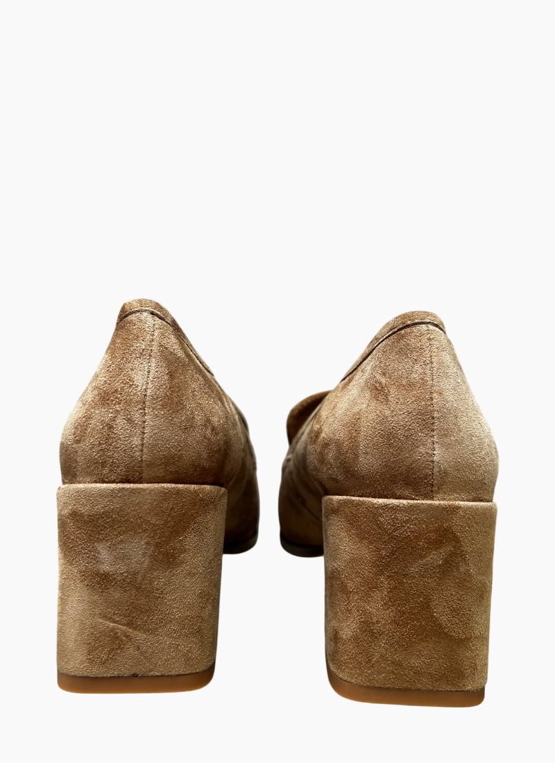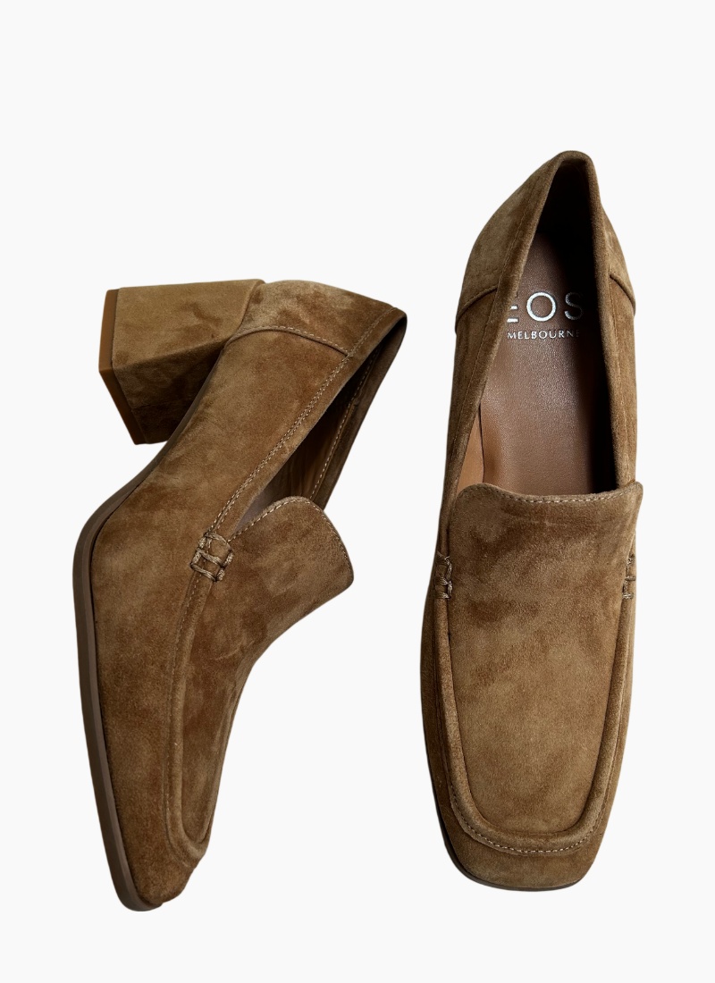 Introducing the Verde Suede Heel Almond from EOS. This elegant almond-coloured suede heel blends classic loafer lines with a modern block heel for an effortlessly polished look.