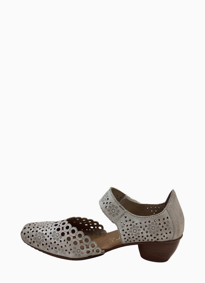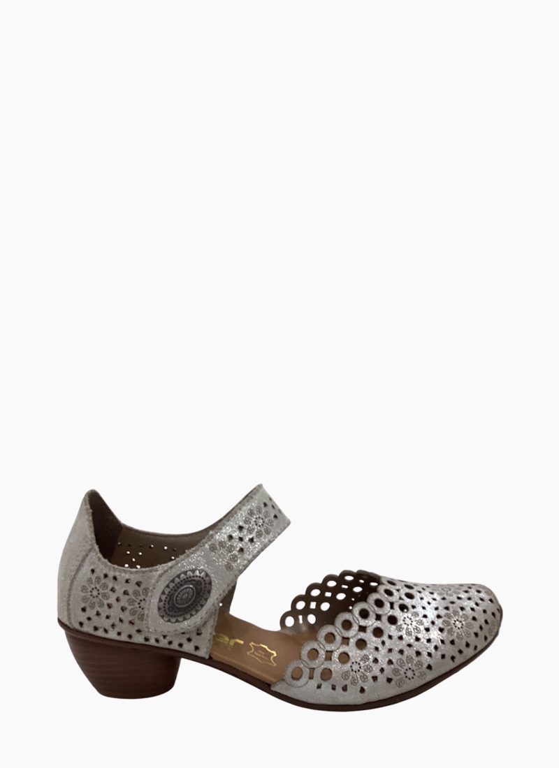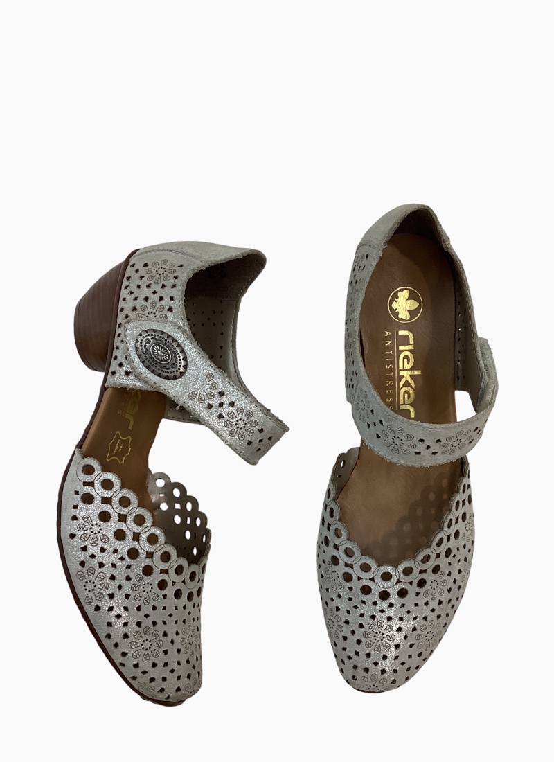 Introducing the 43753-90 Heel Silver from Rieker. This charming metallic heel blends comfort with delicate detailing.