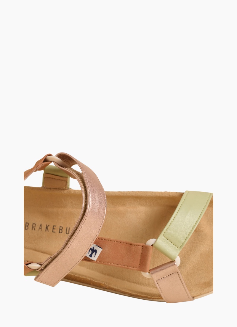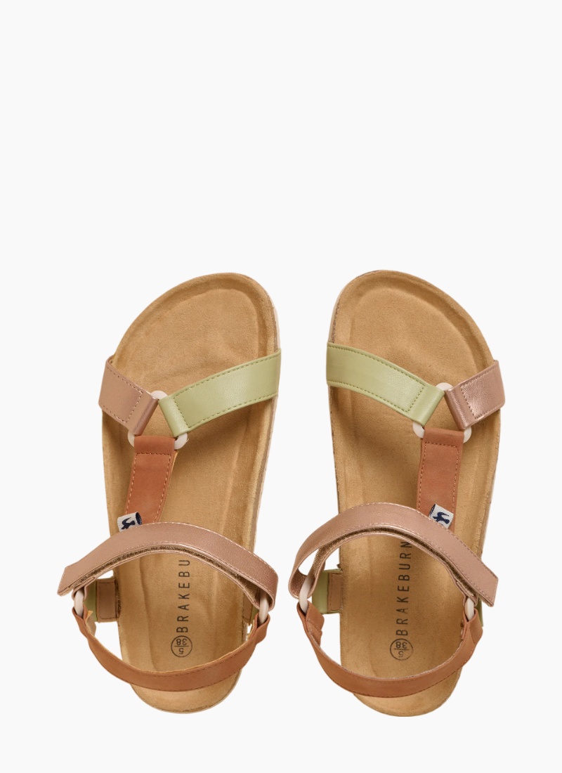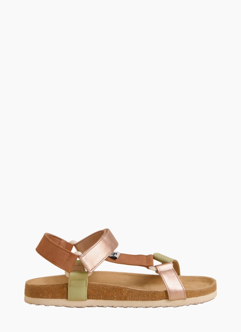Combining neutral tones and metallic bronze, these classic sandals add a touch of understated elegance to any outfit. A practical style in faux leather, with adjustable Velcro ankle straps and sturdy moulded cork soles, they are perfect for everyday wear or dressing up a casual look.