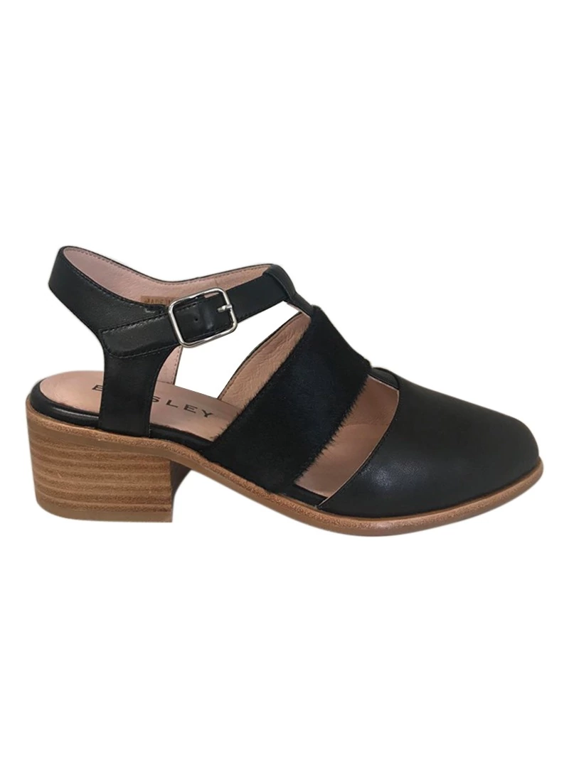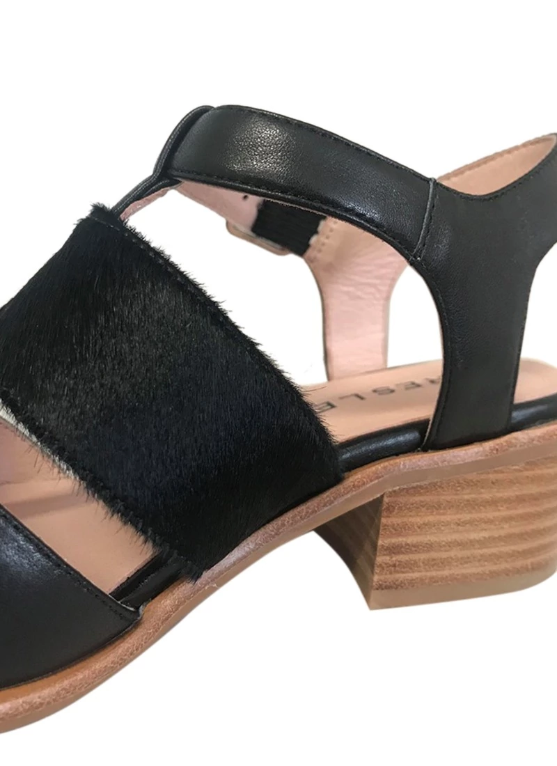 - Black pony finishing on middle strap, rest of shoe leather finishing