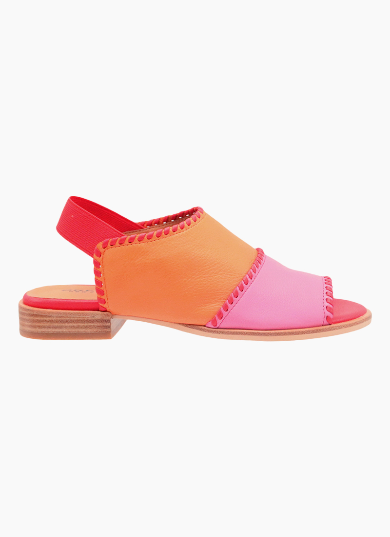 Casual chic soft leather sandals by well-loved brand Bresley. Create a laid-back holiday look by teaming these up with shorts or a sarong...then pop them on with a skirt or pants when you return to work. Enjoy a pop of colour in your wardrobe with this colourway Fusya Multi accents. Soft leather with feature topstitching. Elastic back strap and a low heel on a lightly padded sole.