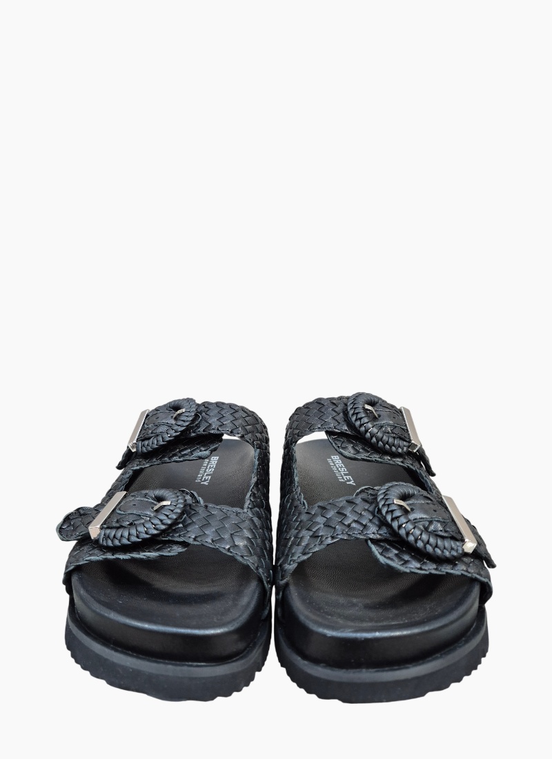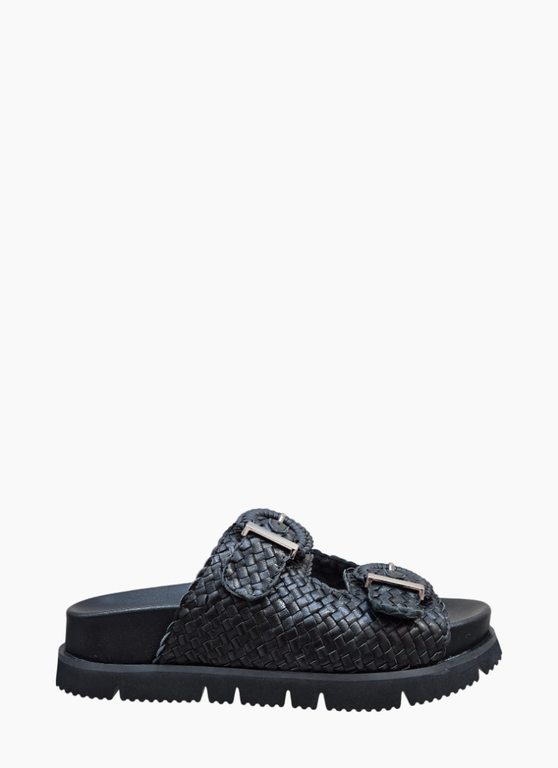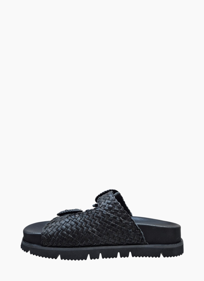 - Handcrafted woven leather upper in deep black for a textured, boutique look