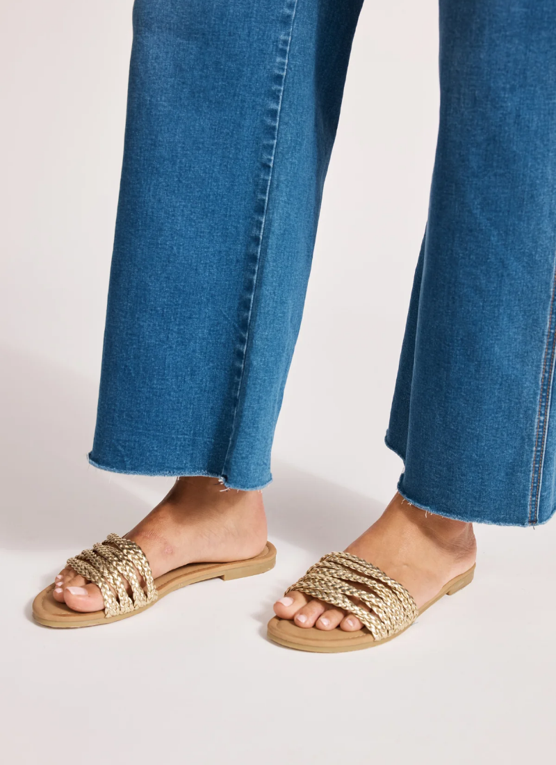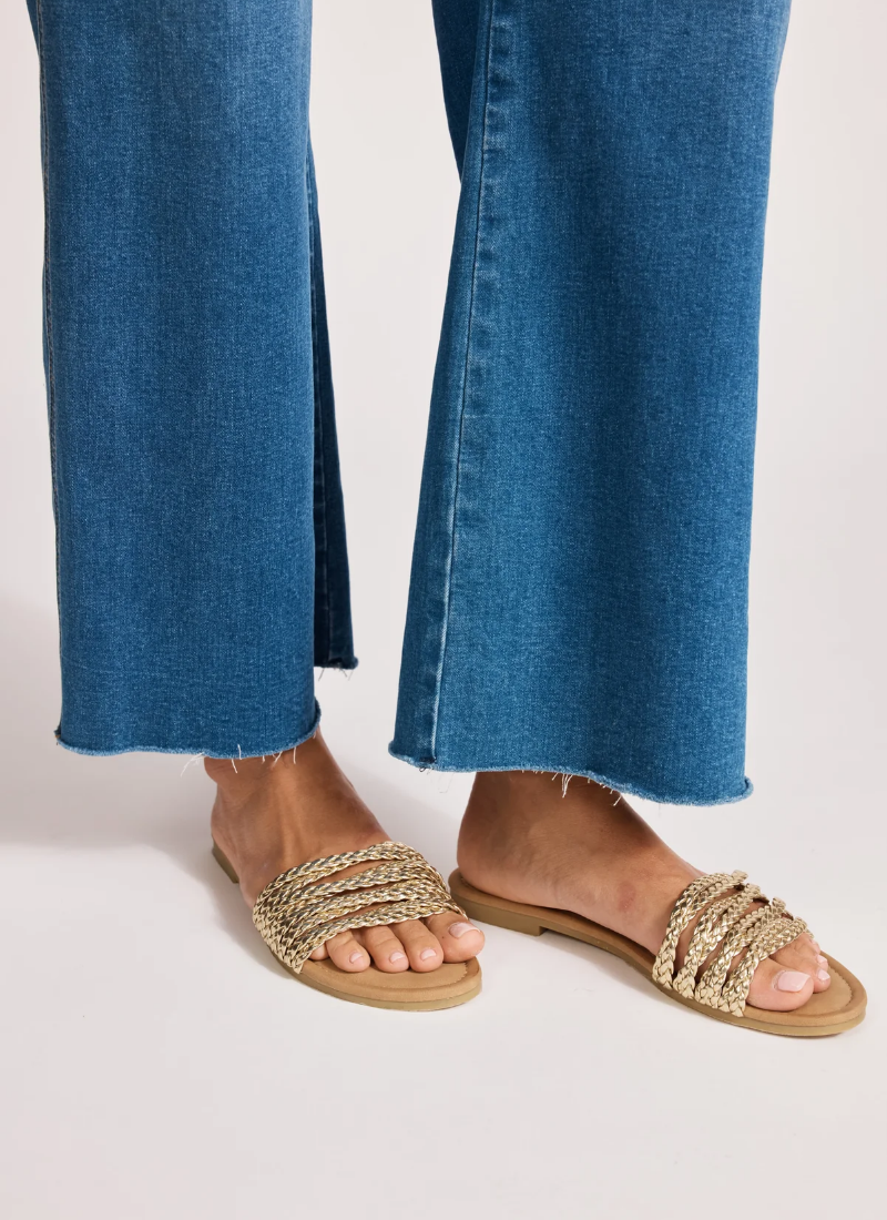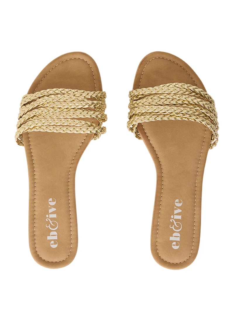 Experience comfort and style with these sandals featuring vegan leather and a woven strap design. The cushioned sole ensures all-day ease, while the flat slide silhouette offers effortless wearability.