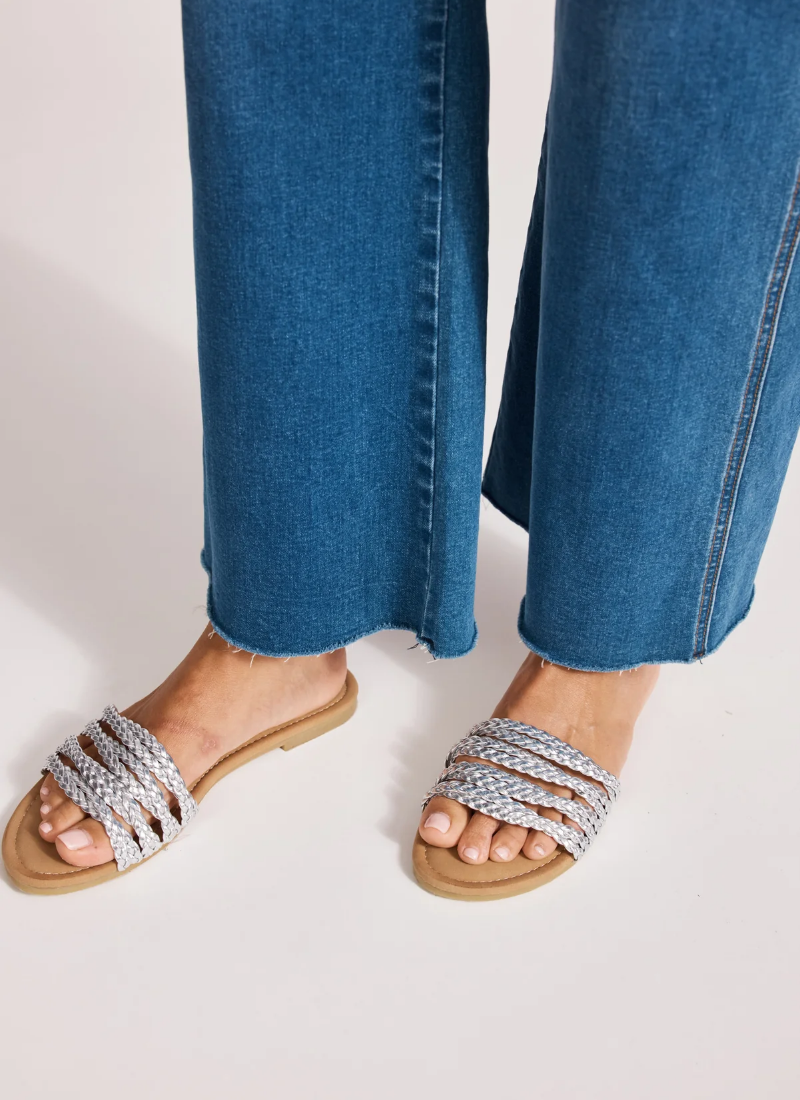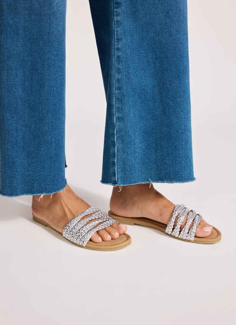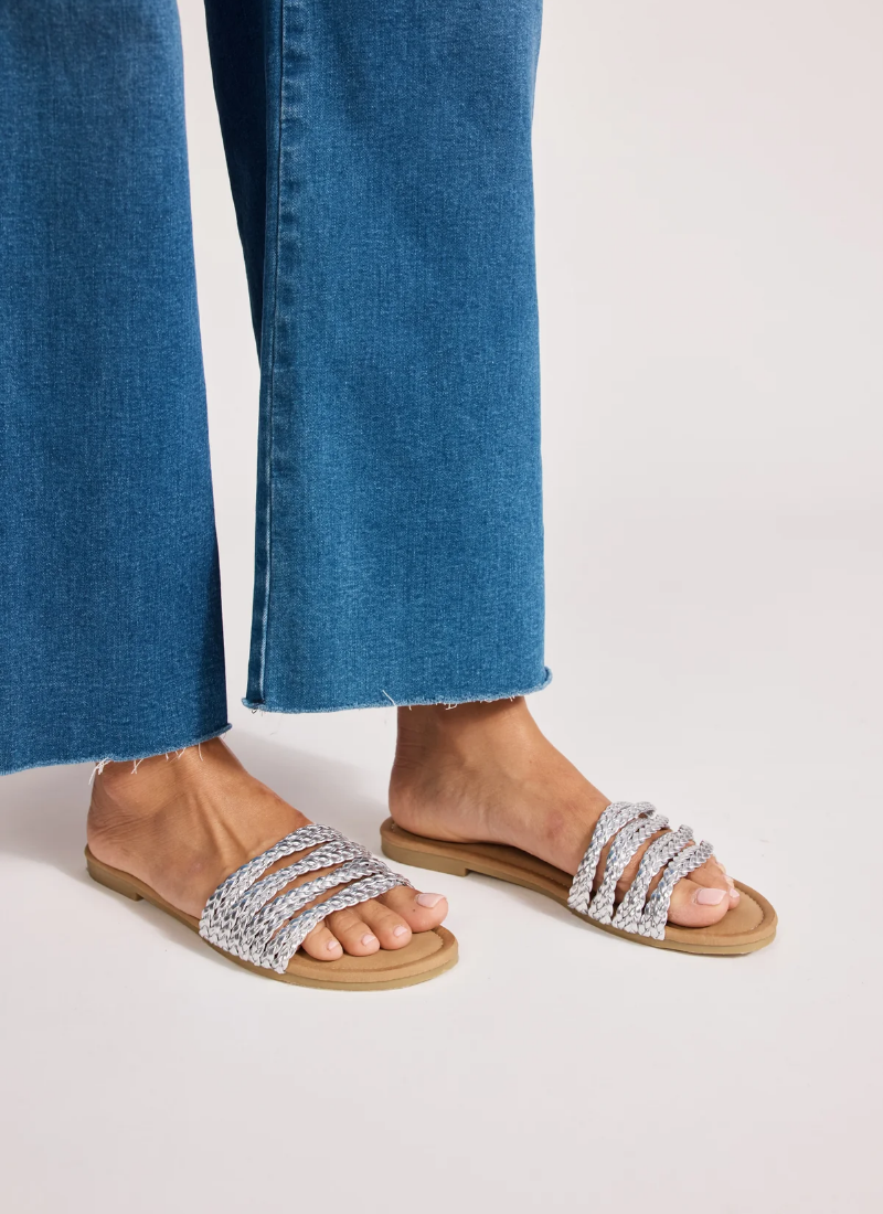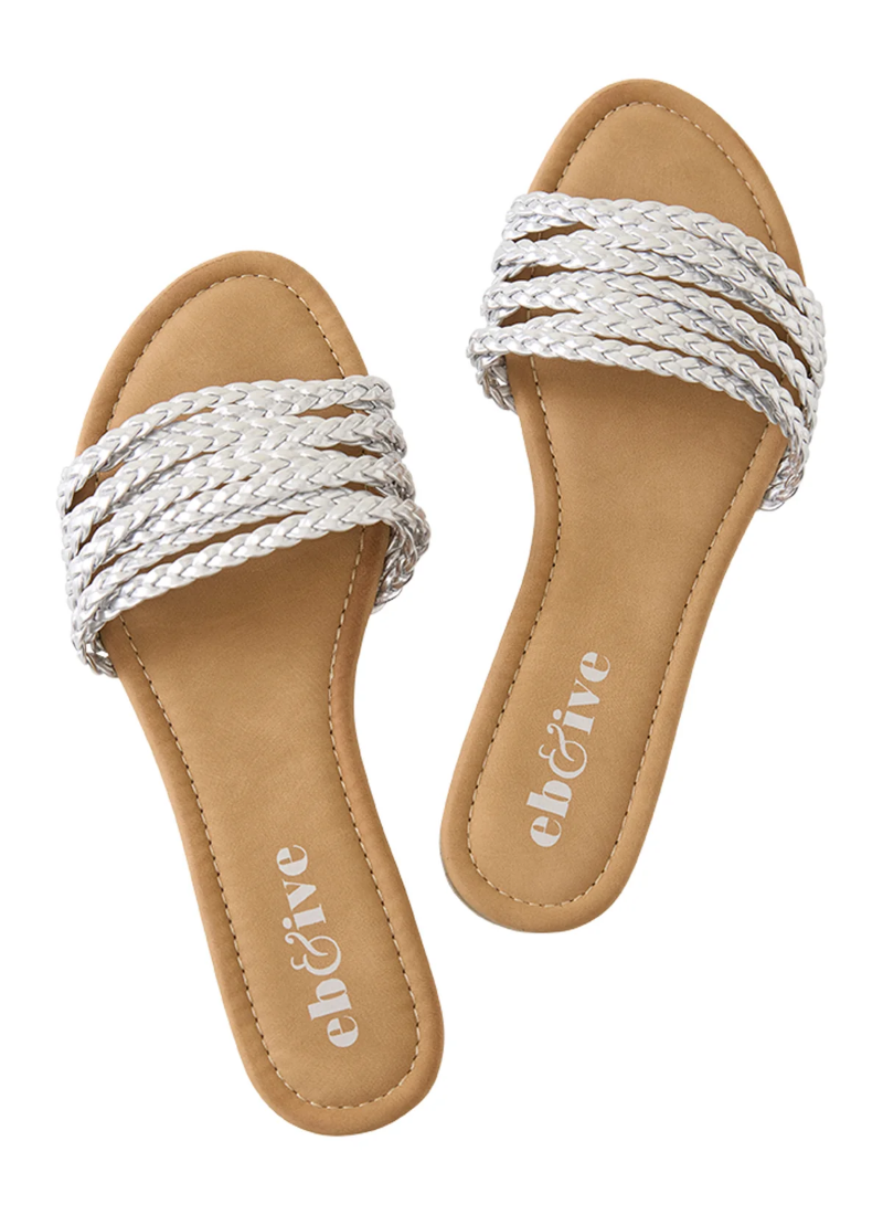 Experience comfort and style with these sandals featuring vegan leather and a woven strap design. The cushioned sole ensures all-day ease, while the flat slide silhouette offers effortless wearability.