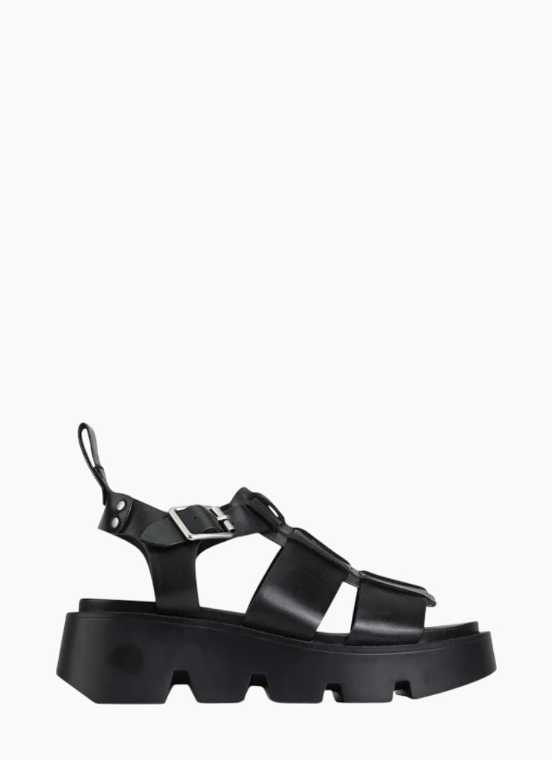 - Crafted from a smooth black leather upper with wide crossover straps for an architectural silhouette