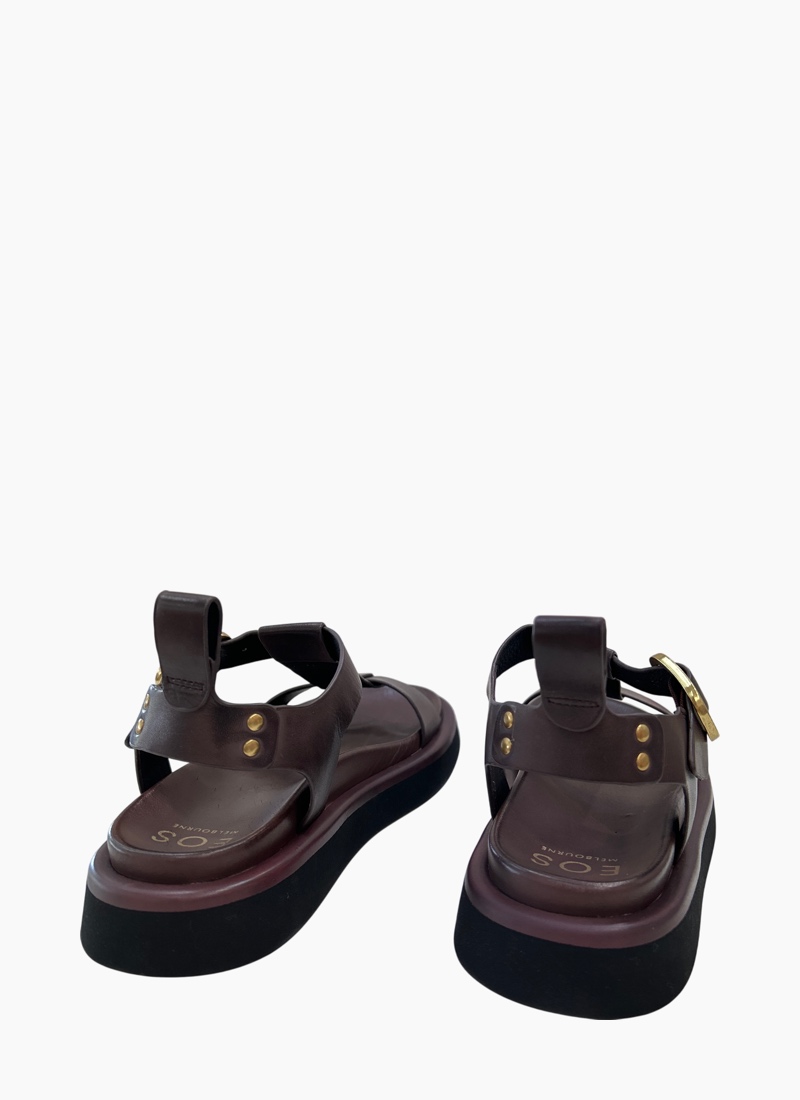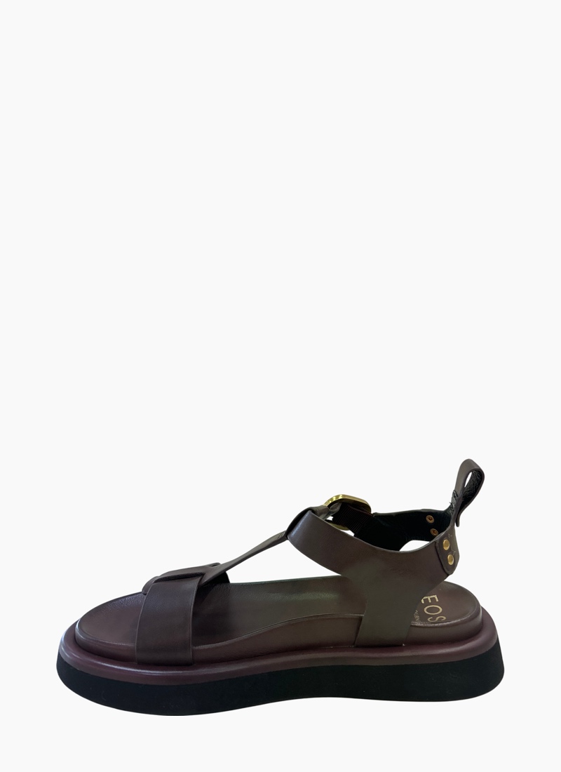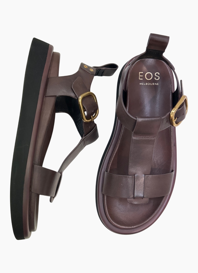 Introducing the Slays Sandal Chestnut from EOS. A modern statement sandal crafted for everyday wear.Anatomical Footbed: Designed to provide excellent support, the footbed is wrapped in luxurious top-grain cow leather. Its lightweight construction, combined with hand-burnished edges, ensures a comfortable and custom fit. Gold-Rated Leather Upper: The sandal features a high-quality gold-rated leather upper, sourced from the Leather Working Group. Hand-burnished on the last for a smooth, rich finish, it offers both durability and elegance. T-Bar Design: The standout T-bar style is both on-trend and timeless, adding a chic touch to any outfit while providing an elegant silhouette.