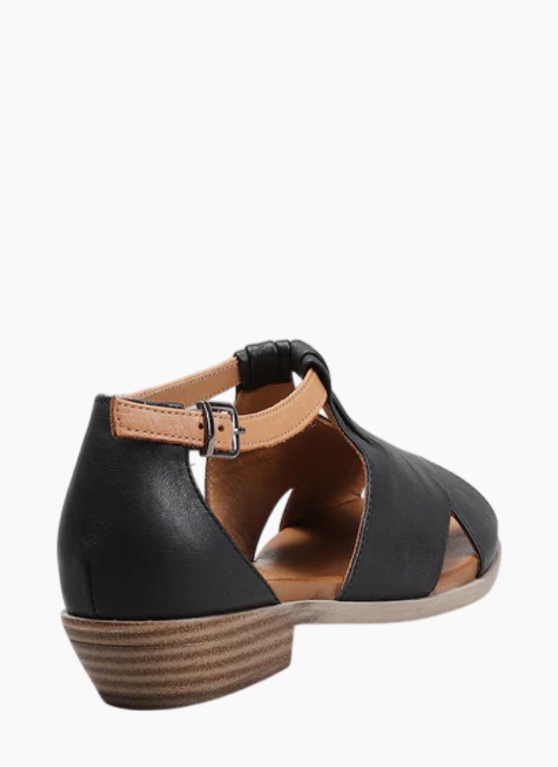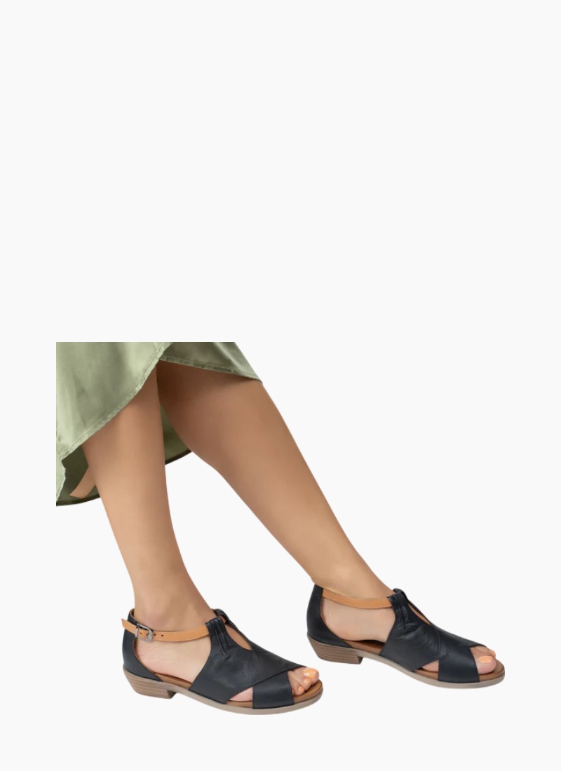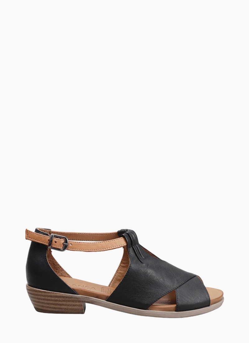 - Category: Women’s Shoes (Sandals), Colour: Black with tan accents, Material: Leather