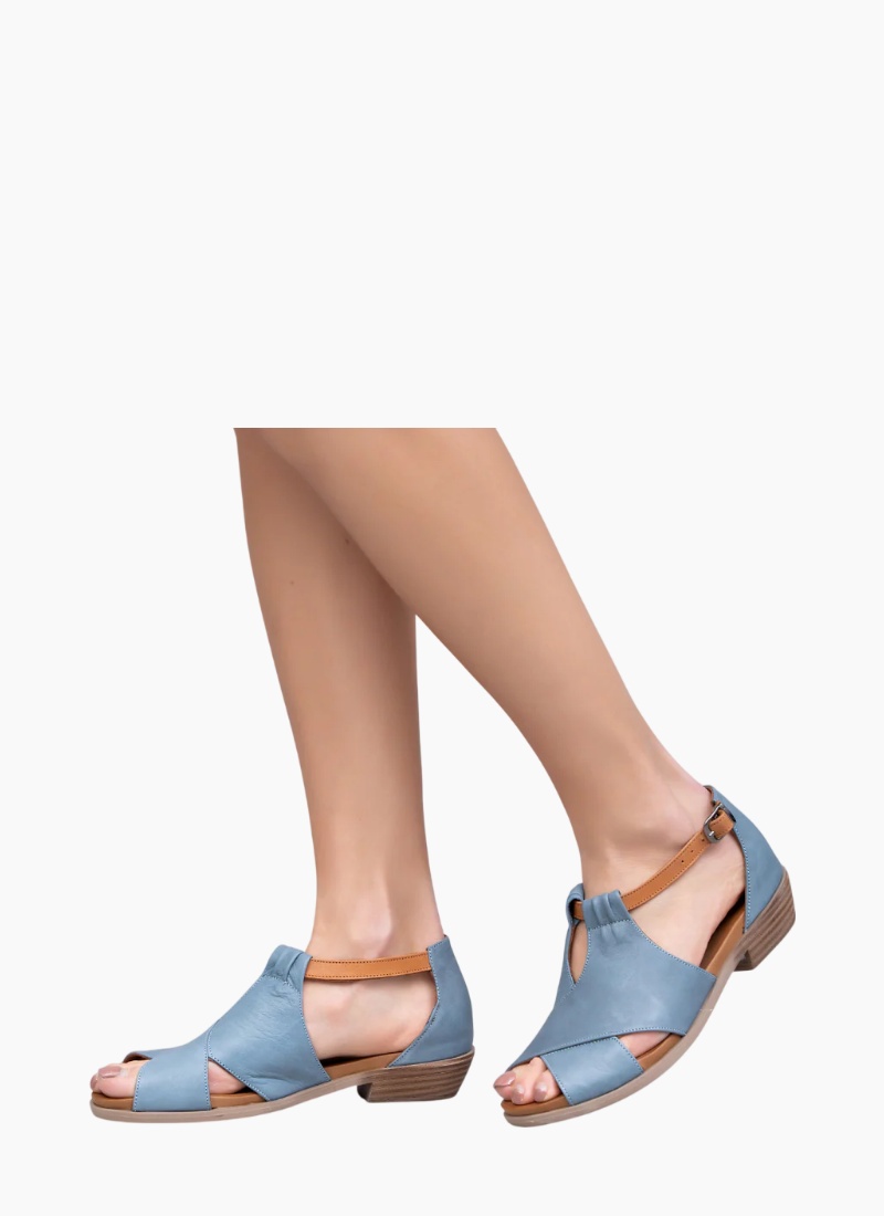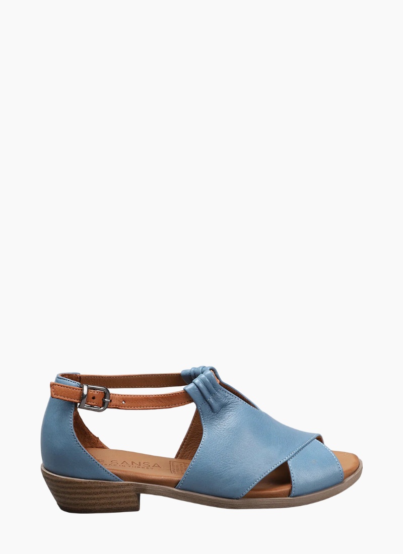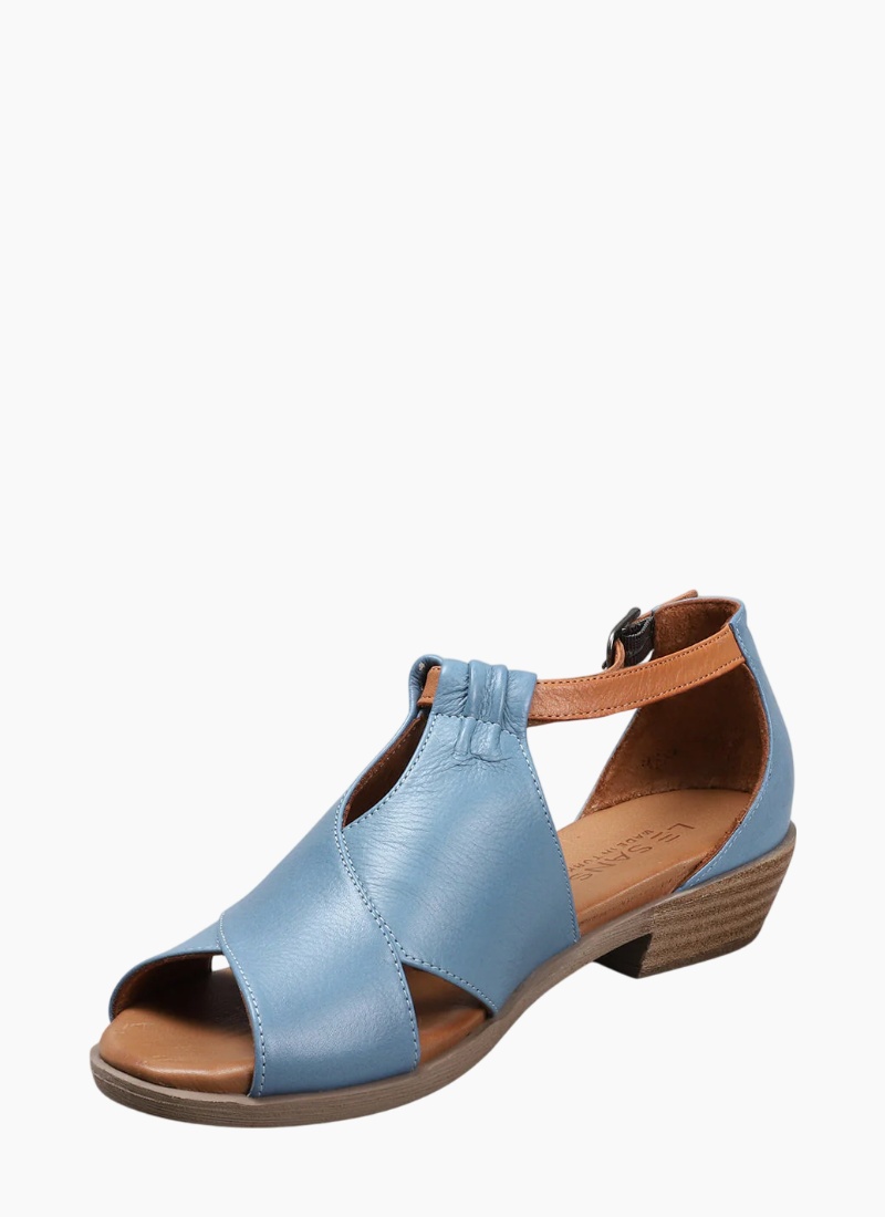 Introducing the LE SANSA Digby Denim Tan sandal from LE SANSA. A refined everyday piece that pairs a light blue leather upper with a contrasting tan ankle strap for polished, comfortable summer style.