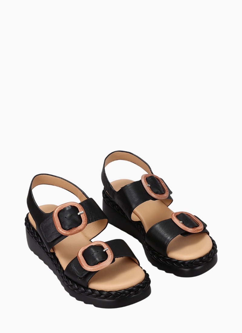 - Crafted from soft black leather with two wide straps and oversized wooden-look buckles for a signature statement