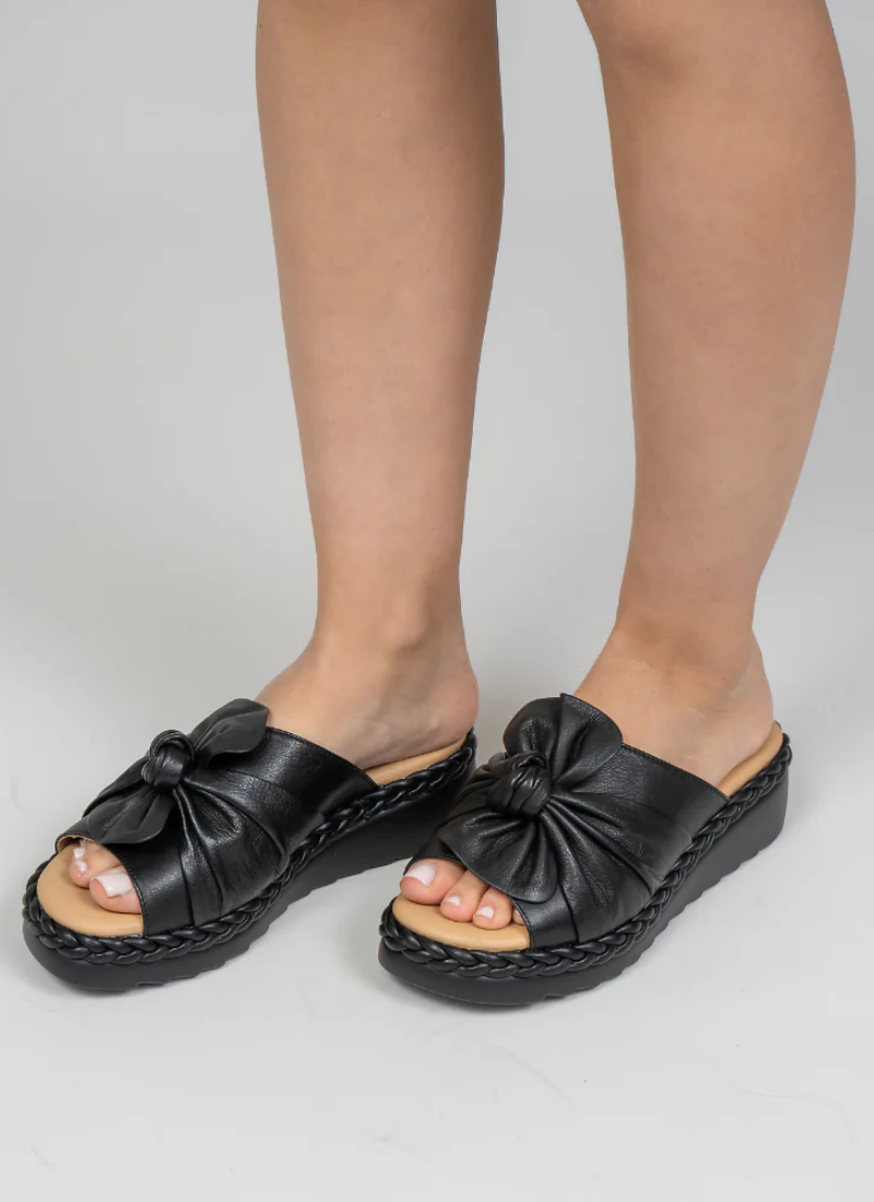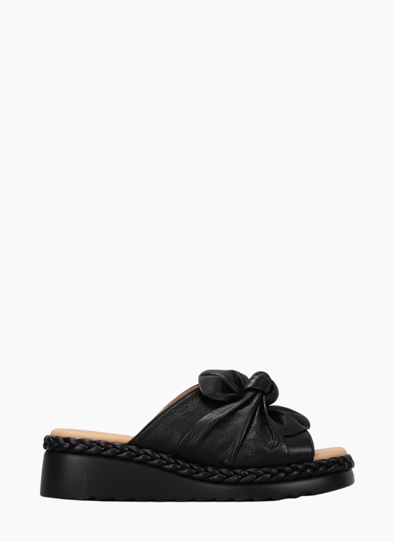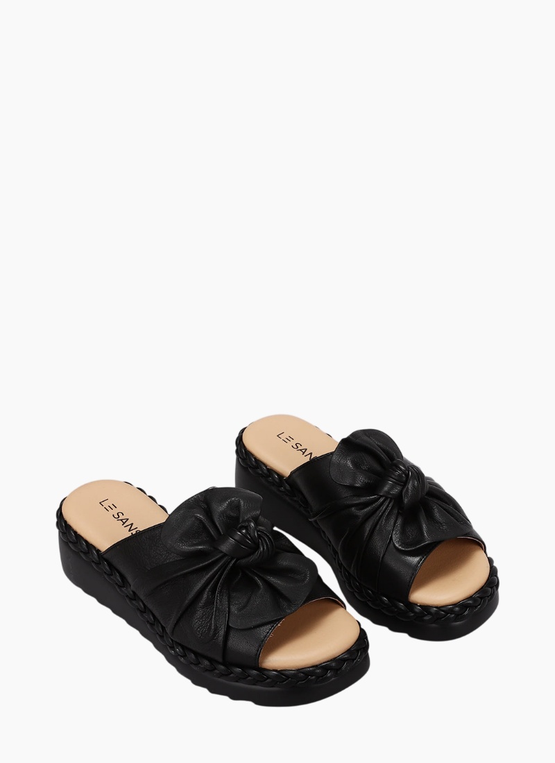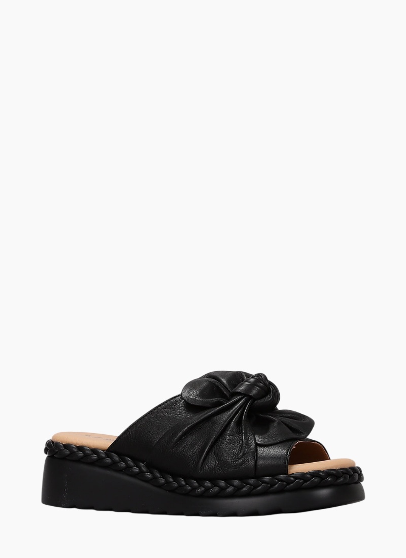 - Hand-finished black leather upper with a knotted, ruched detail for sculptural interest