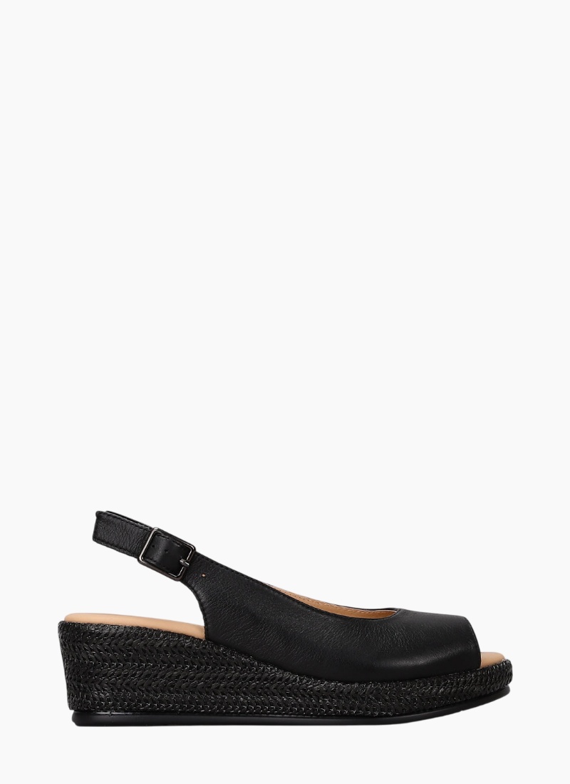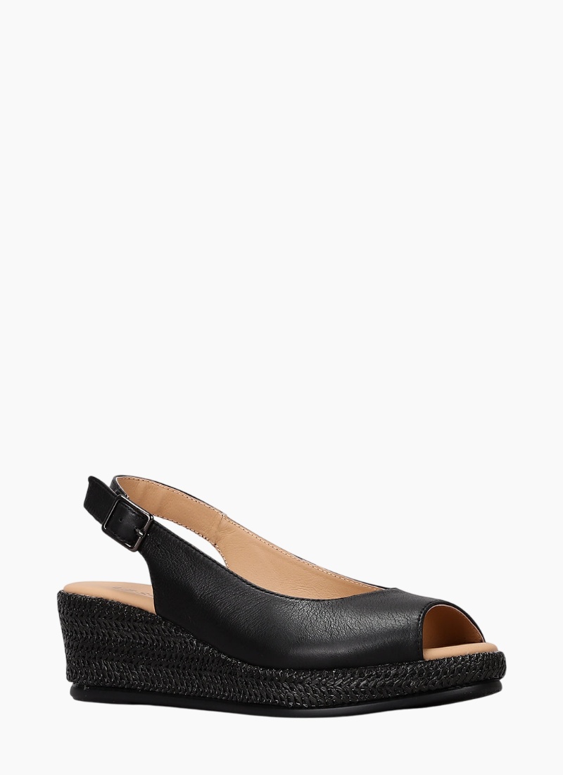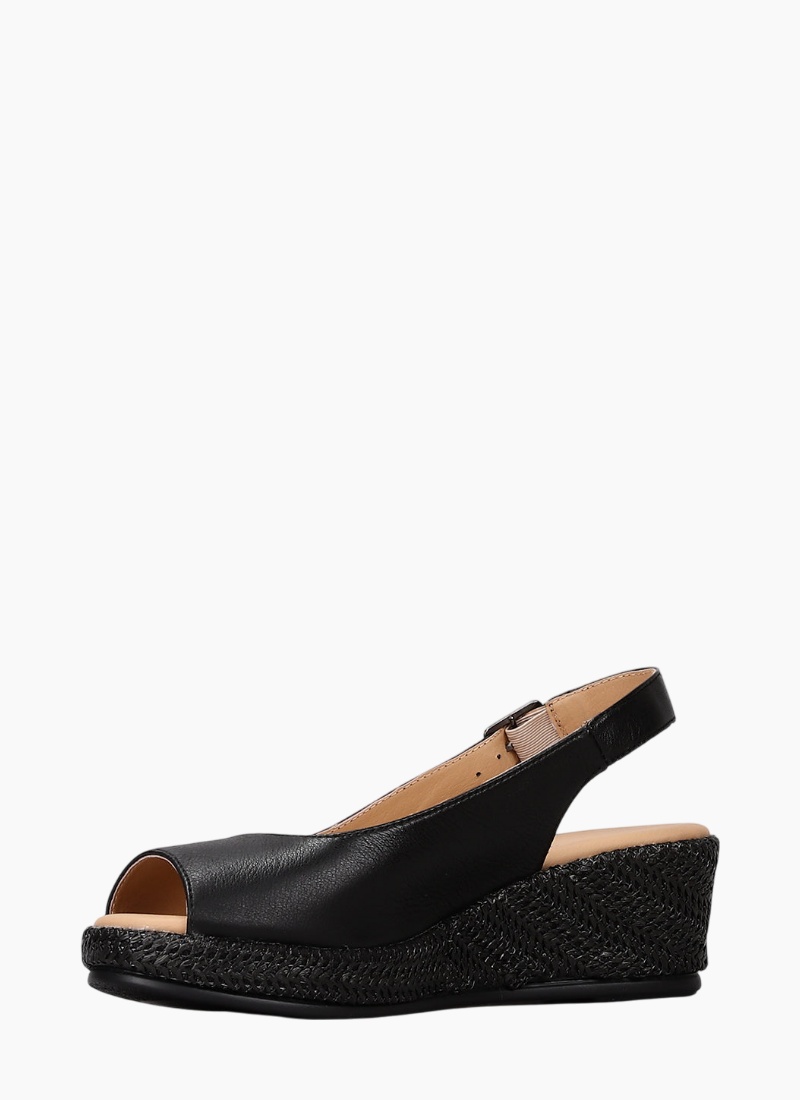Introducing the LE SANSA PETUNIA BLACK from LE SANSA. This polished black leather wedge sandal lifts everyday dressing with effortless poise.